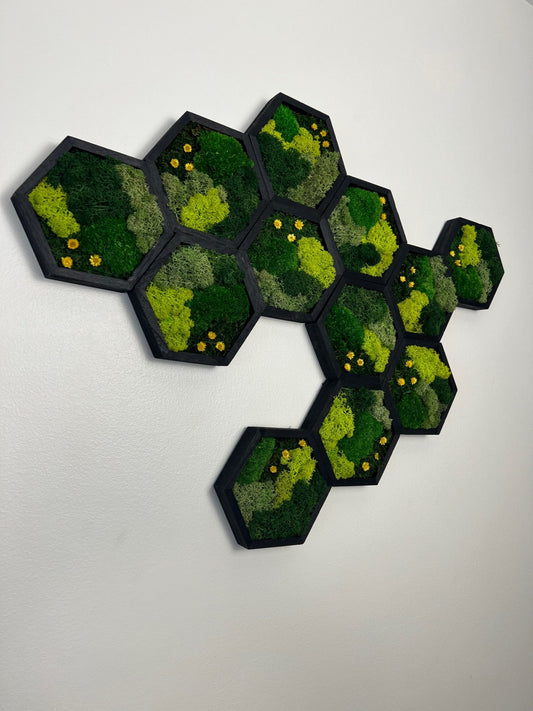 Honeycomb Moss Wall Art: Preserved Reindeer Moss, Wood Hexagon Frame | USA - TARIFF FREE