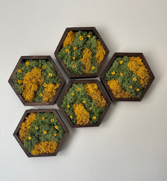 Moss Wall Art | Honeycomb Moss Single to Set of Twelve | Home Decor | Wood Hexagon | Green Yellow Preserved Flowers | Mothers Day Gift