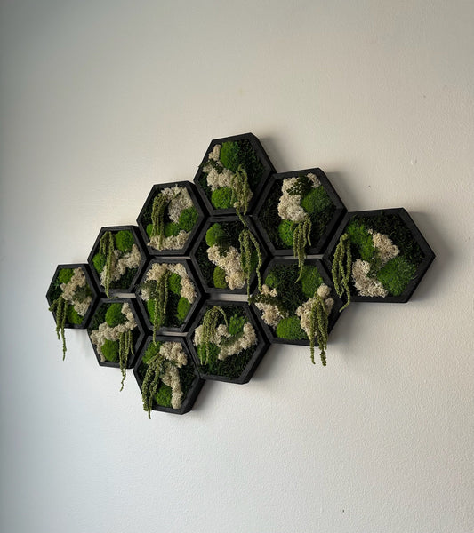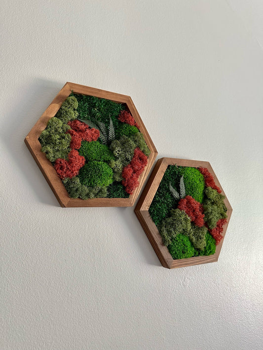 Moss Wall Art Decor | Handmade Wood Hexagon | Single Set to Six (8" x 9") or (10" x 11.6") | Preserved Lichen, Pole, Sheet Moss & Fern