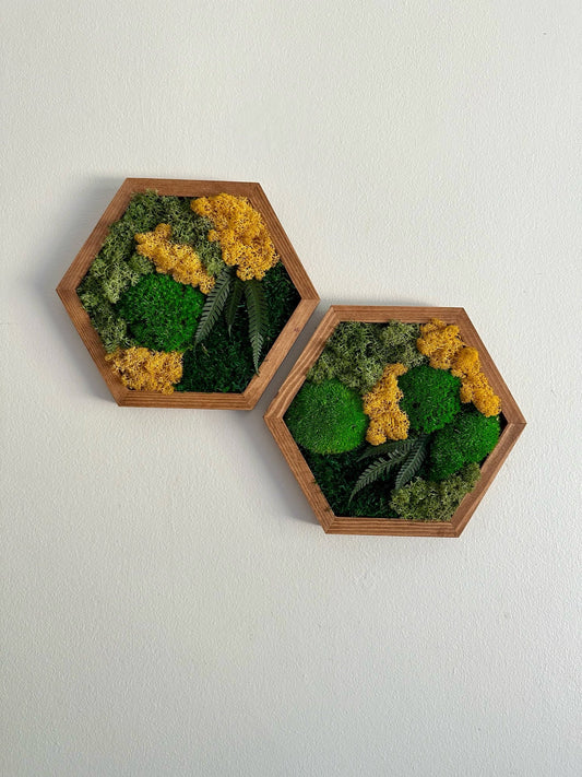 Moss Wall Art Decor | Handmade Wood Hexagon | Single Set to Six (8”x 9" each) | Preserved Lichen Moss, Pole Moss, Sheet Moss & Fern