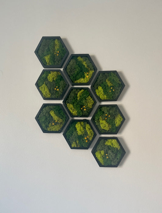 Moss Wall Art | Hexagon Moss Decor | Single to Set of Twelve | Wood Frame | Black Frame | Green with Yellow Preserved Flowers Reindeer Moss