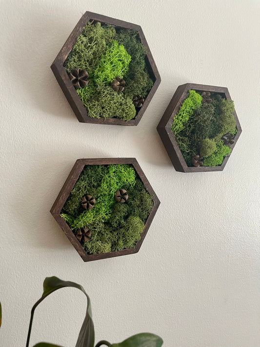 Honeycomb Moss Wall Art: Wood Hexagon, Reindeer Moss Decor | USA - TARIFF FREE