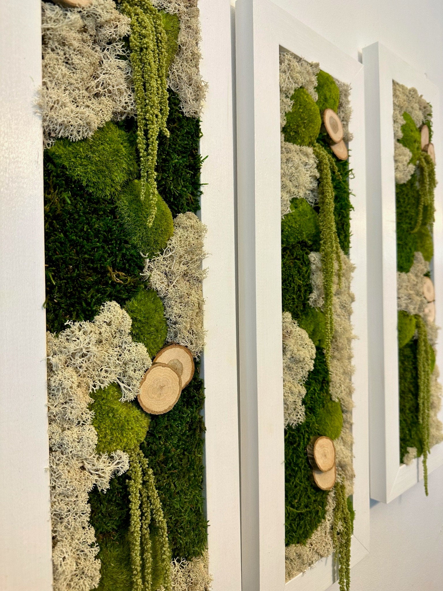 The includes one to six - 24" by 8" wood frames carefully assembled with preserved reindeer moss, hardware attached for hanging on each frame. The frame can be hung horizontally or vertically.