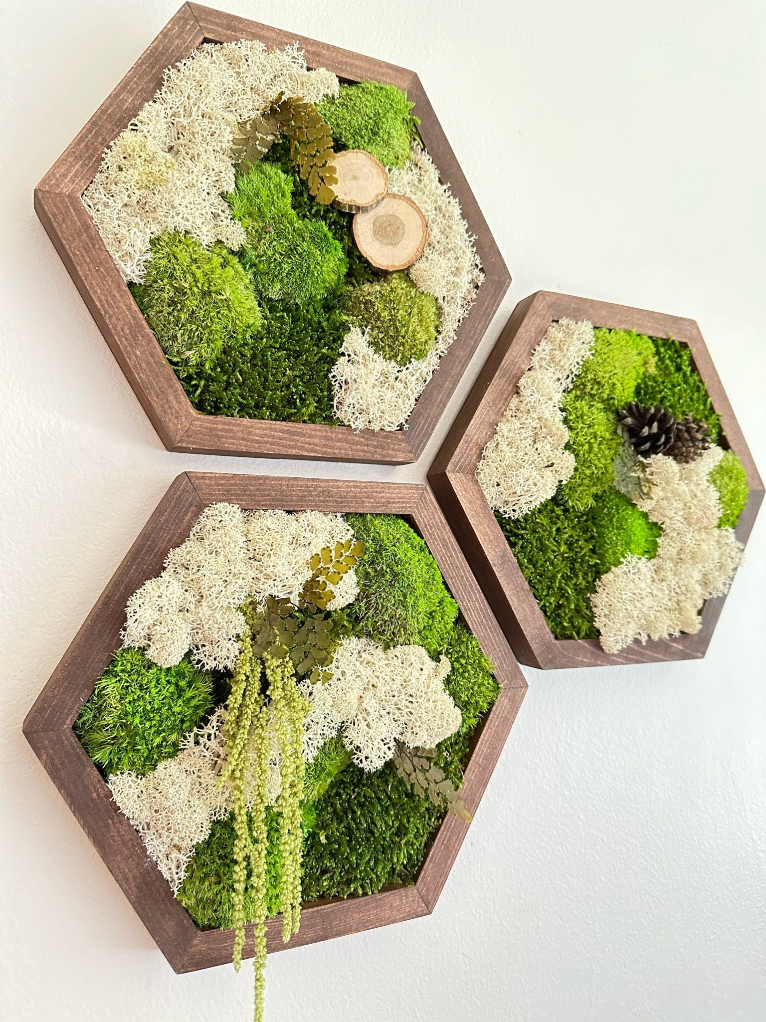 Single to Six hexagons: pieces of 8" by 9" by 1 1/2" wood frames carefully assembled with preserved reindeer moss with twine and hardware for hanging on each frame.