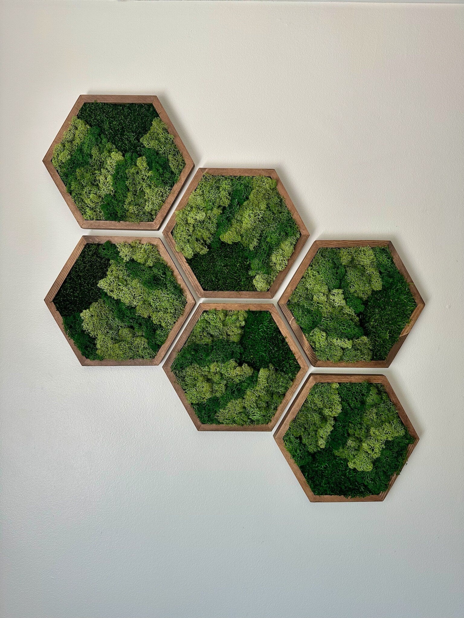 Single to set of six hexagons: pieces of 8 x 9" or 10” x 11.6” by 1 1/2" wood frames carefully assembled with preserved reindeer moss, sheet moss and pole moss with with two ways to hang them (horizontal and vertical) hardware for hanging on each frame.
