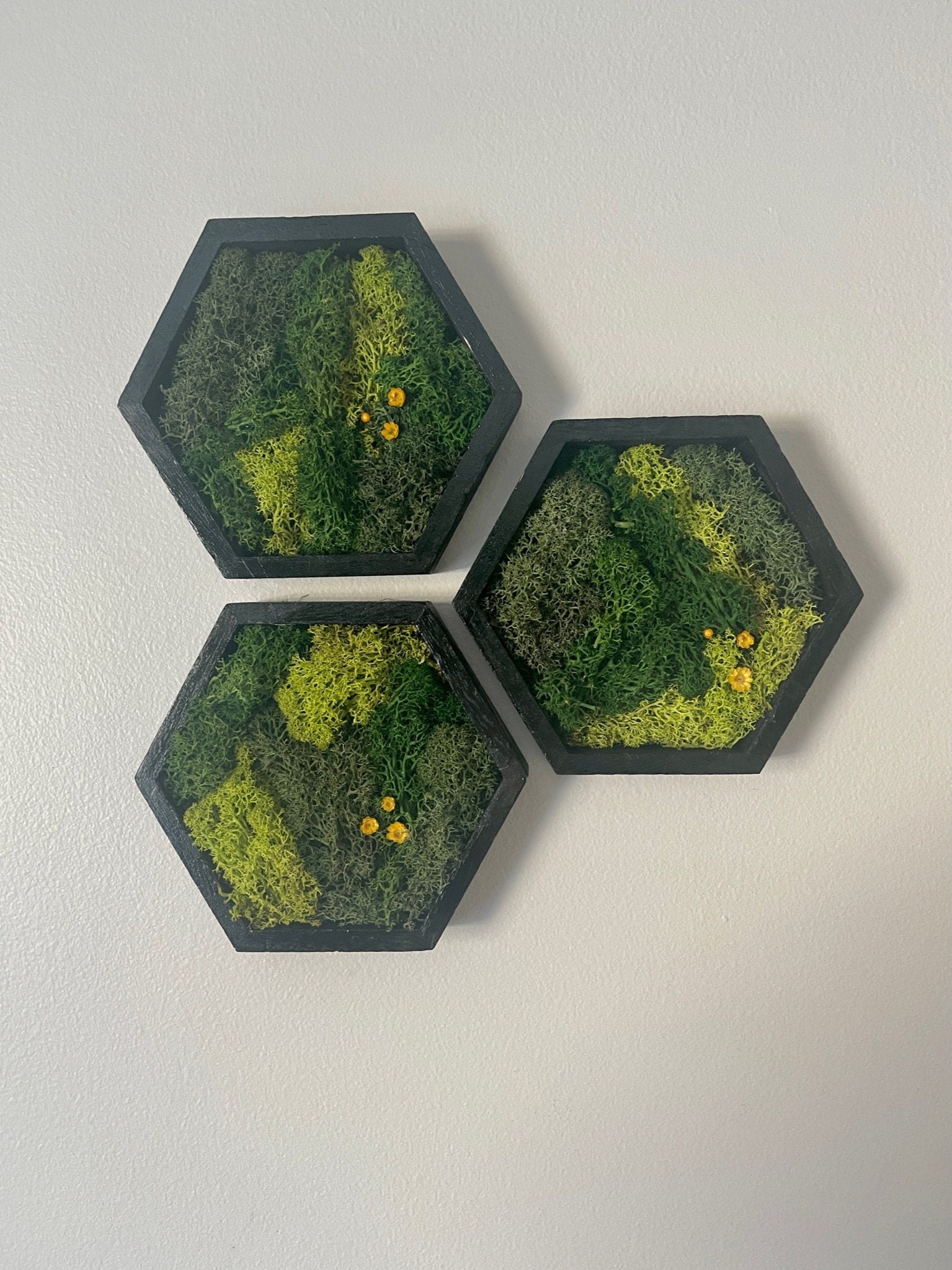 Hexagon Moss Wall Art: Black Frame, Preserved Reindeer Moss & Flowers | USA - TARIFF FREE