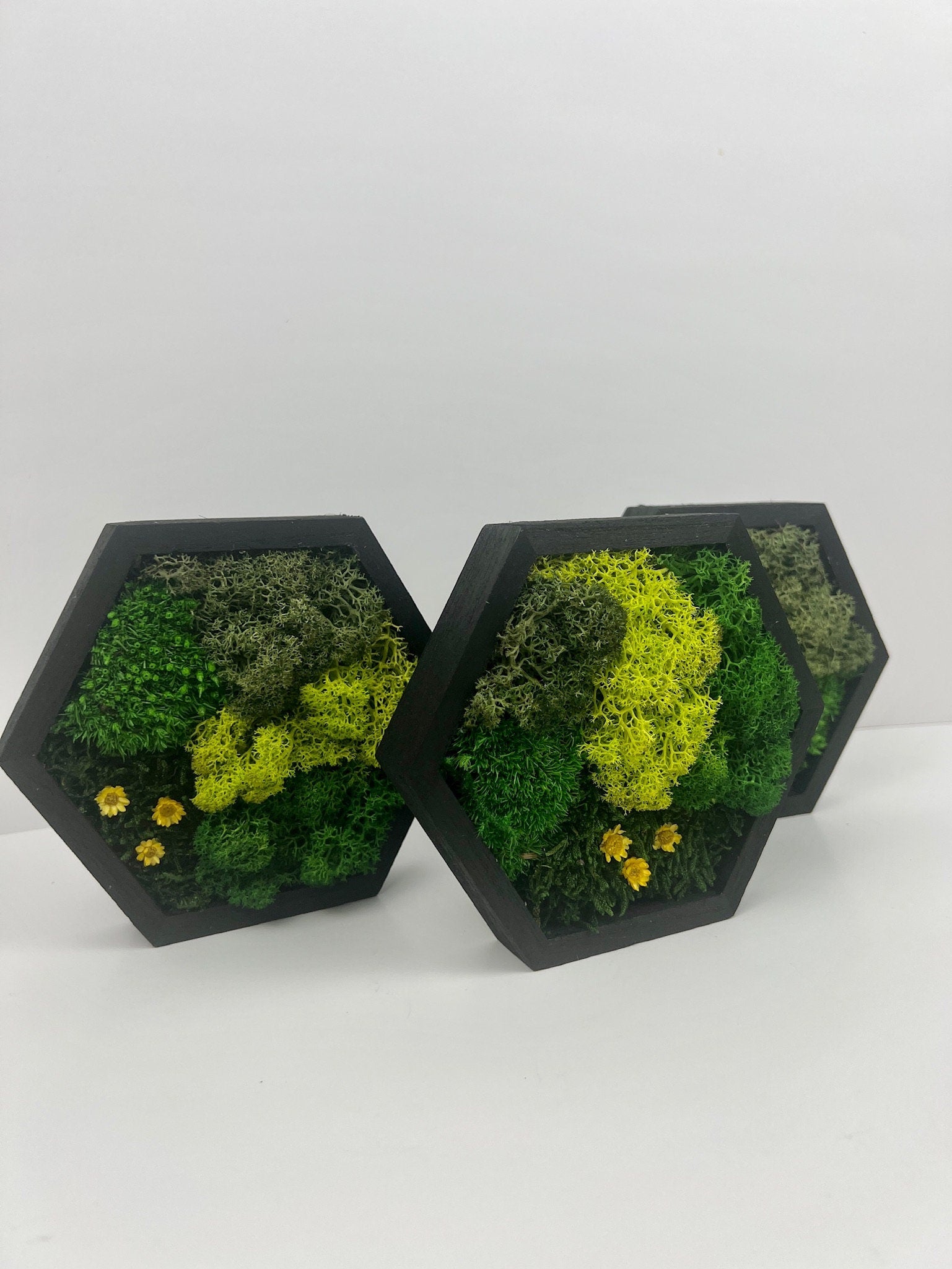 Single to Twelve pieces wood frames carefully assembled with preserved reindeer moss with hardware for hanging on each frame.
