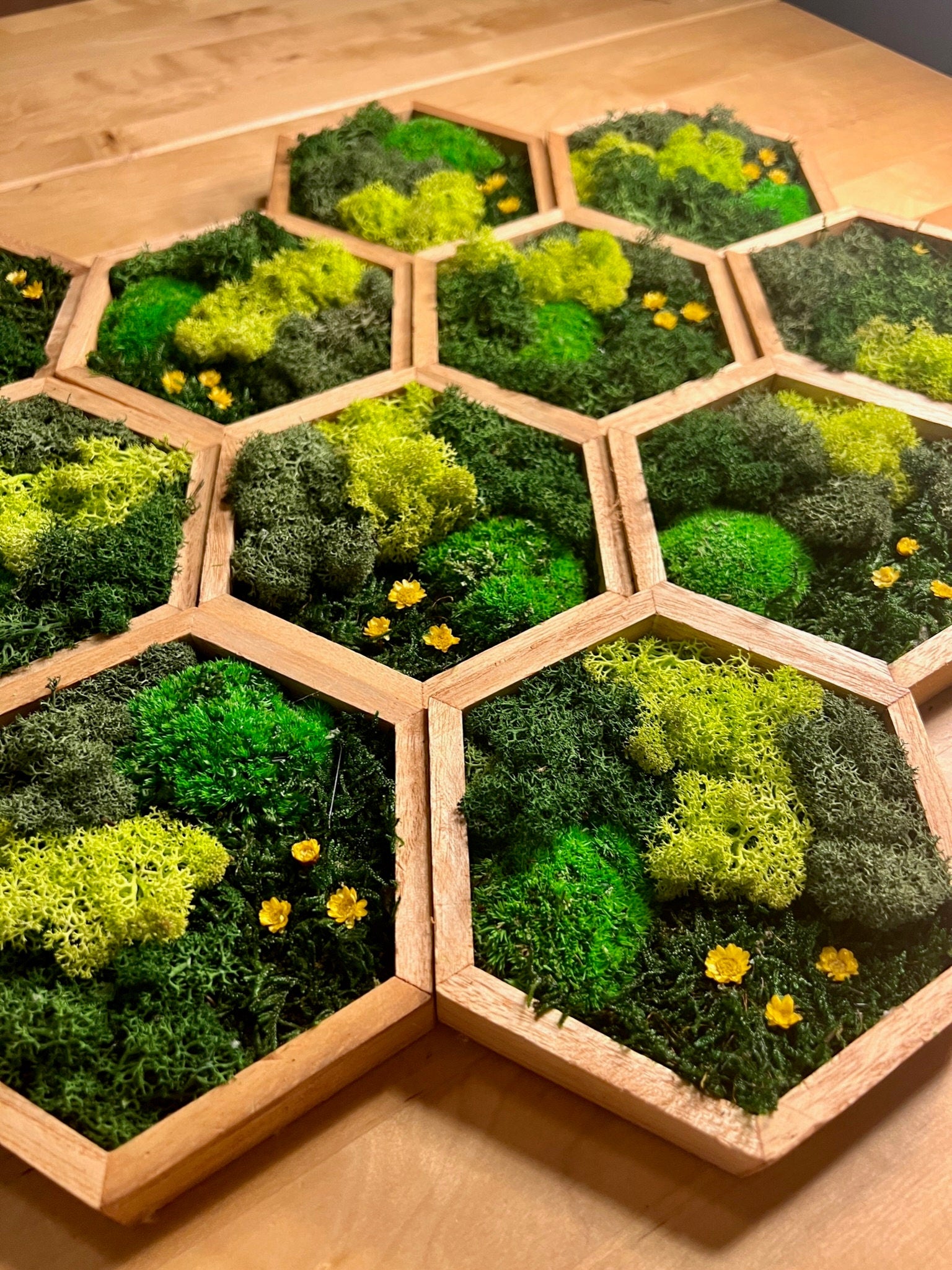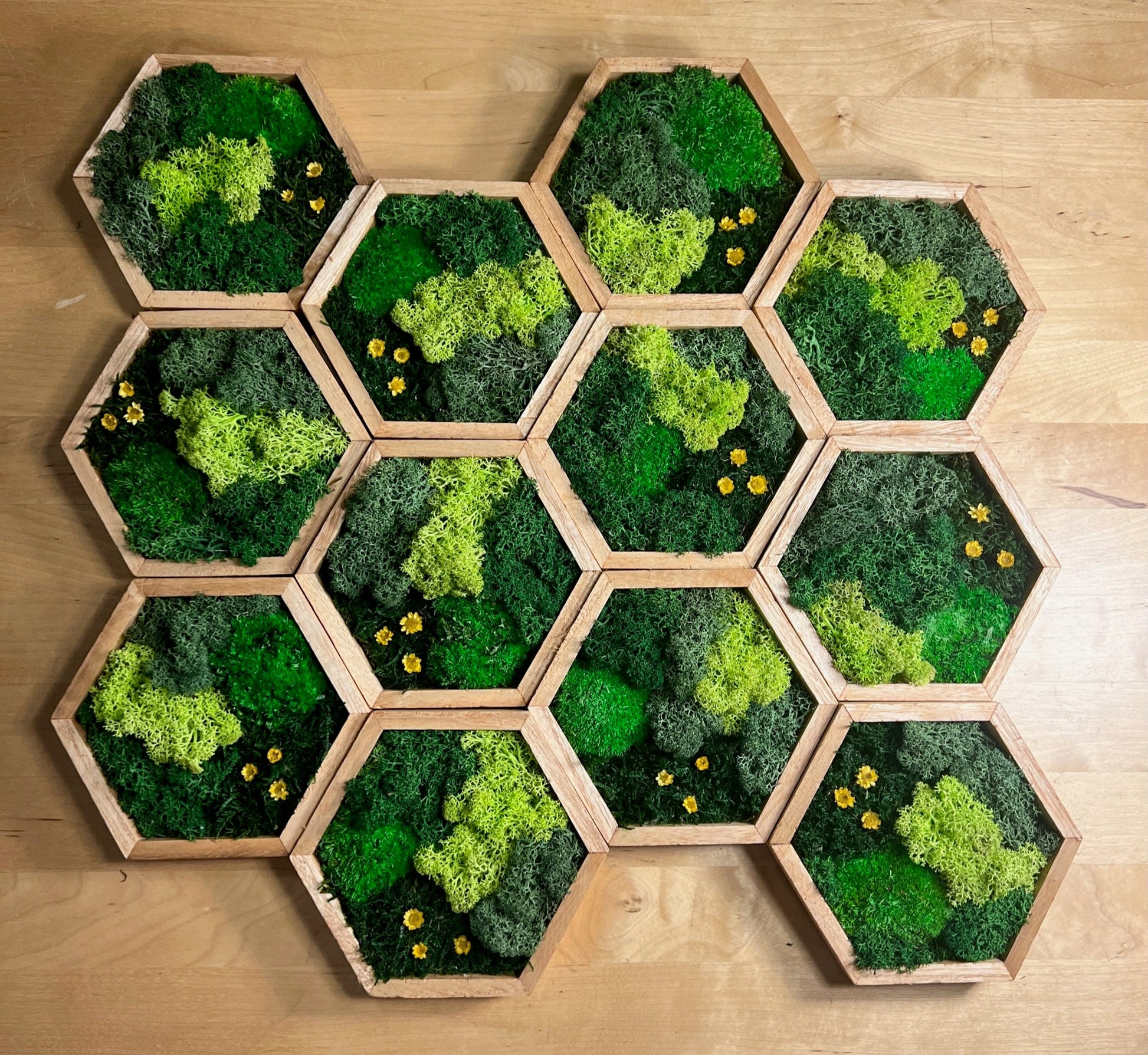 Honeycomb Moss Wall Art: Wood Hexagon with Reindeer Moss & Yellow Flowers | USA - TARIFF FREE