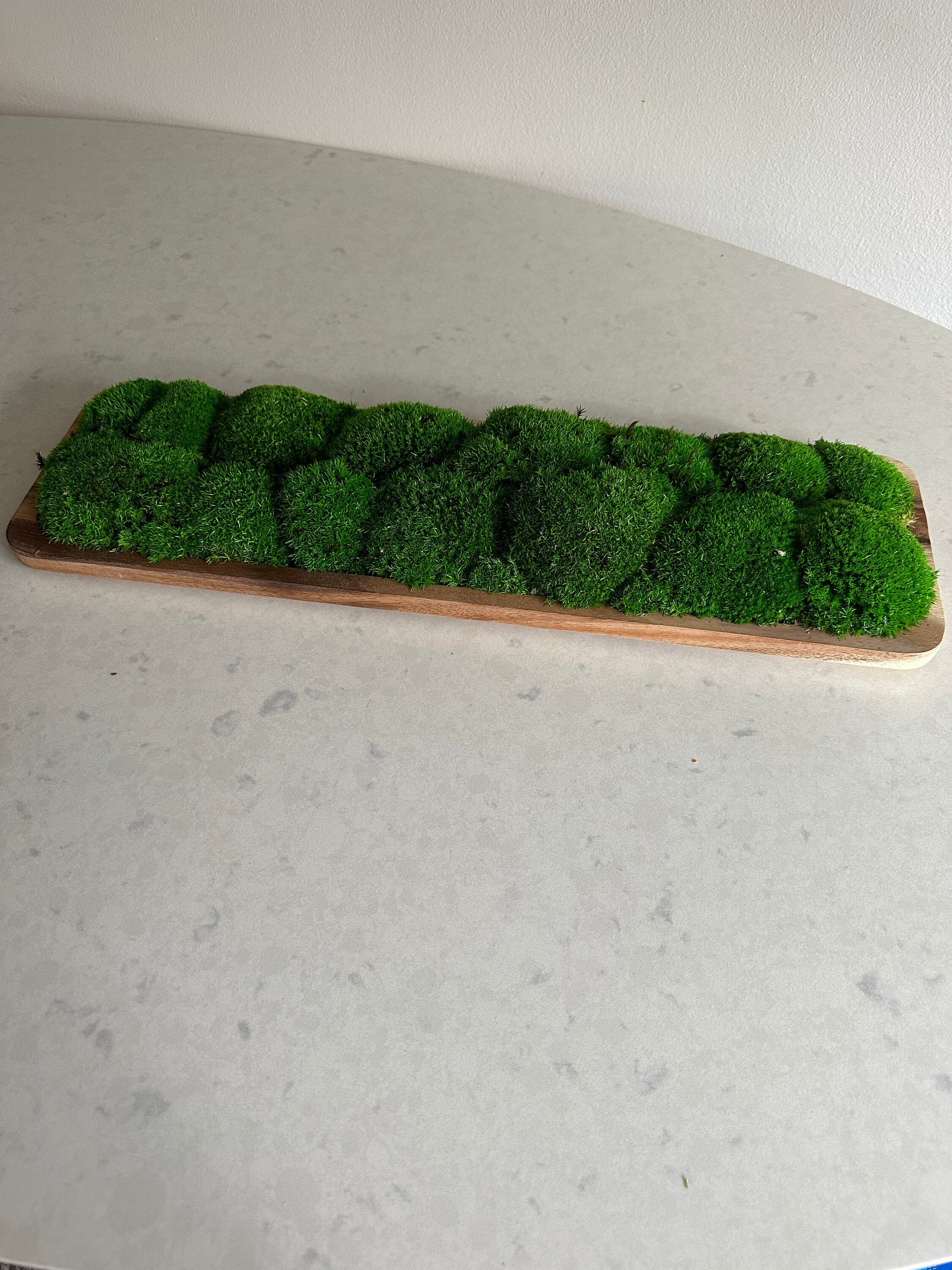 Moss Bowl 19 3/4" length, width 6" by 2 1/2" high, carefully assembled with preserved pole moss and reindeer moss with a olive wood rectangle centrepiece. Beautiful nature centrepiece.