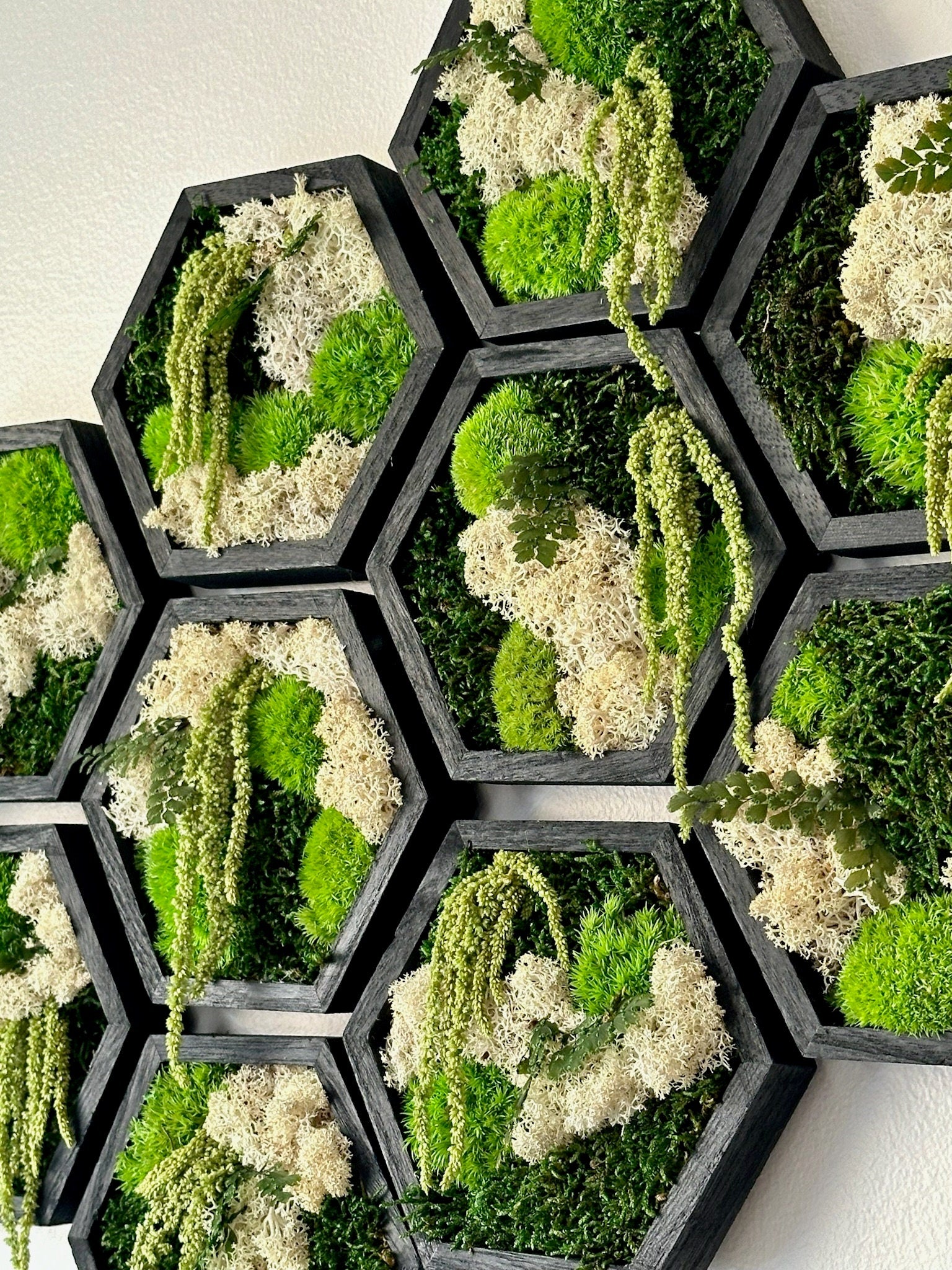 Single to set of Six hexagons: pieces of 8" by 9" by 1 1/2" or 10" x 11.6" wood frames carefully assembled with preserved reindeer moss with twine and hardware for hanging on each frame.
