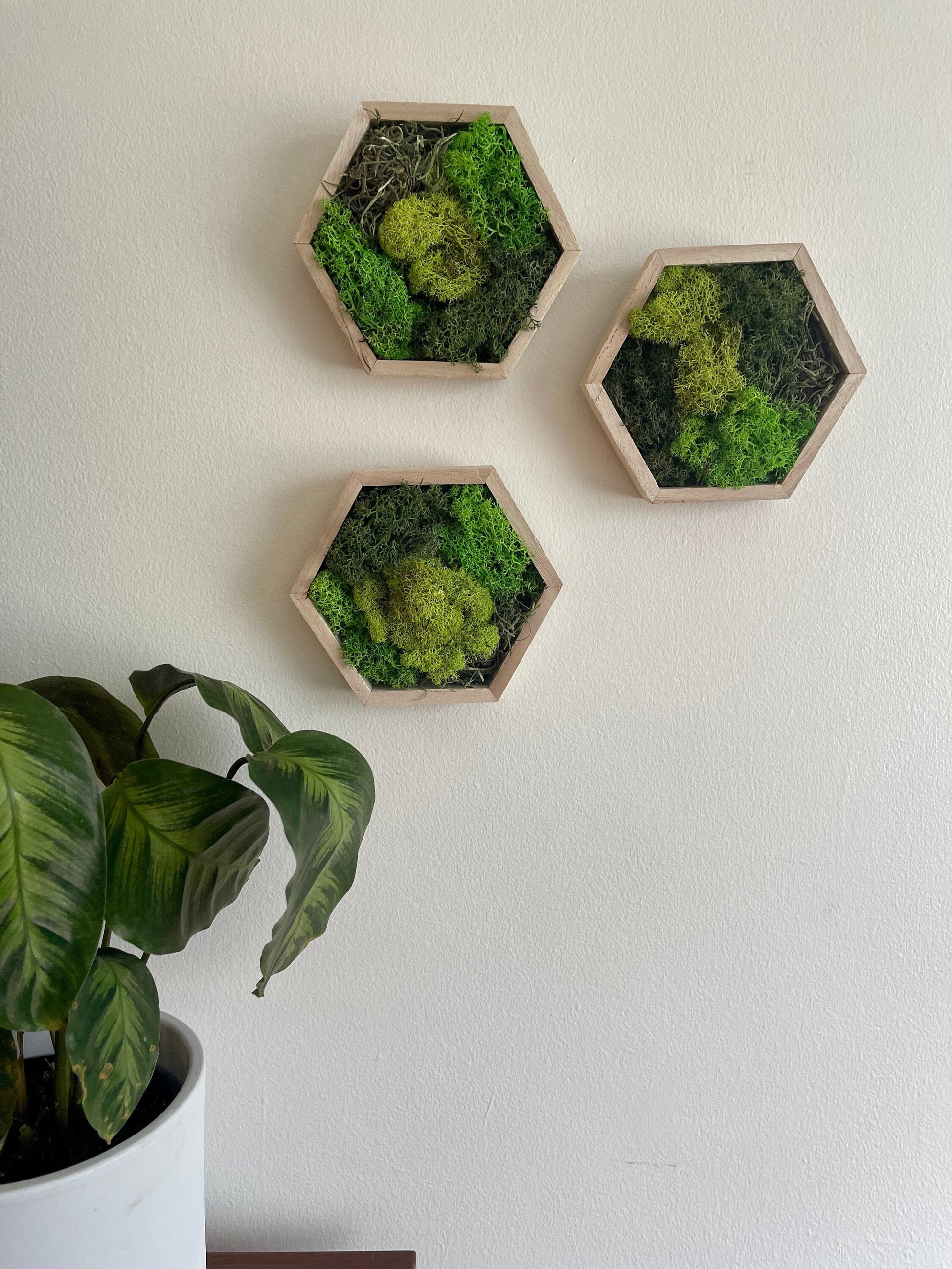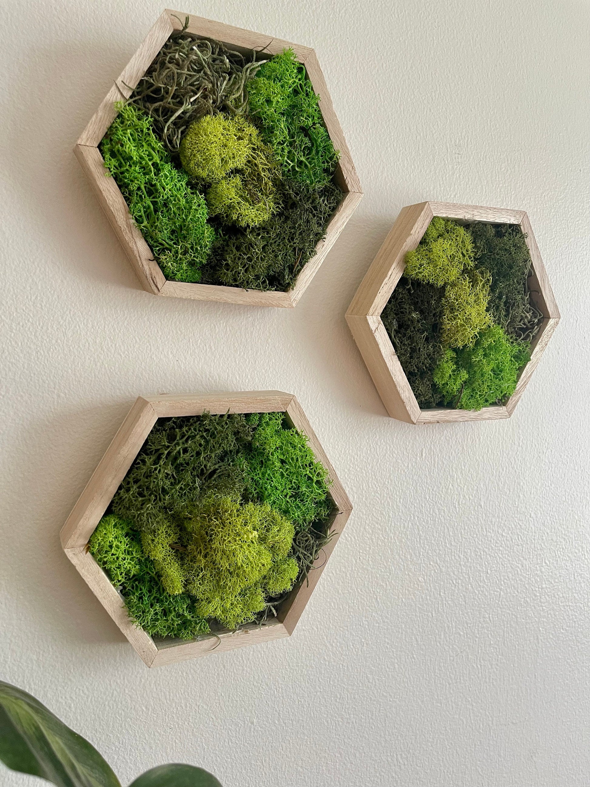 Moss Wall Art | Honeycomb Moss Decor | Single to Set of Twelve | Wood Hexagon | Green Meadow Reindeer Moss
