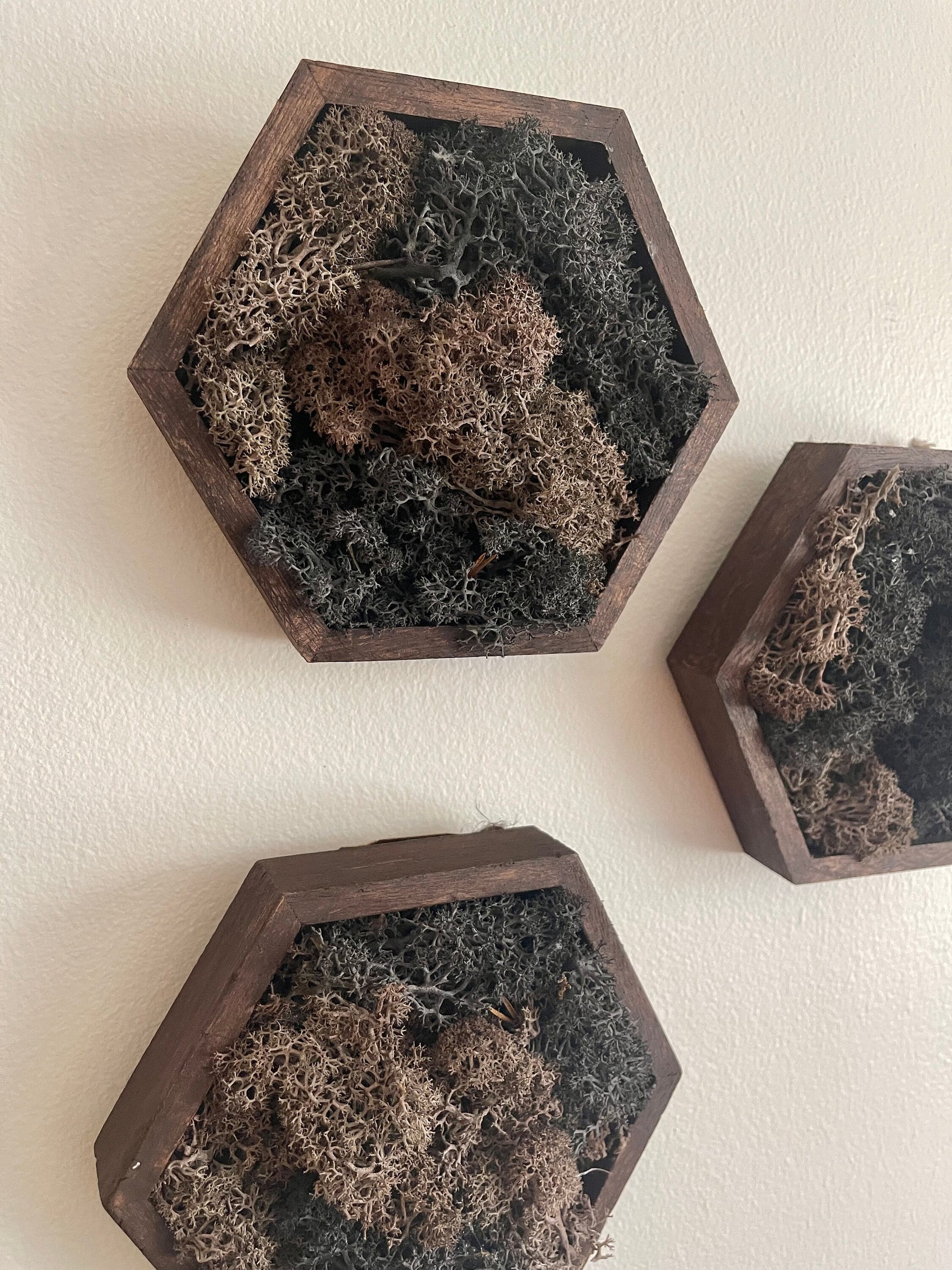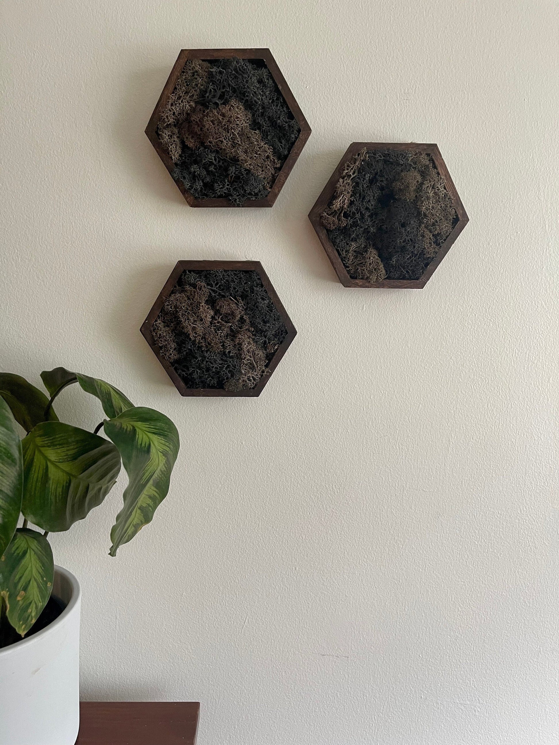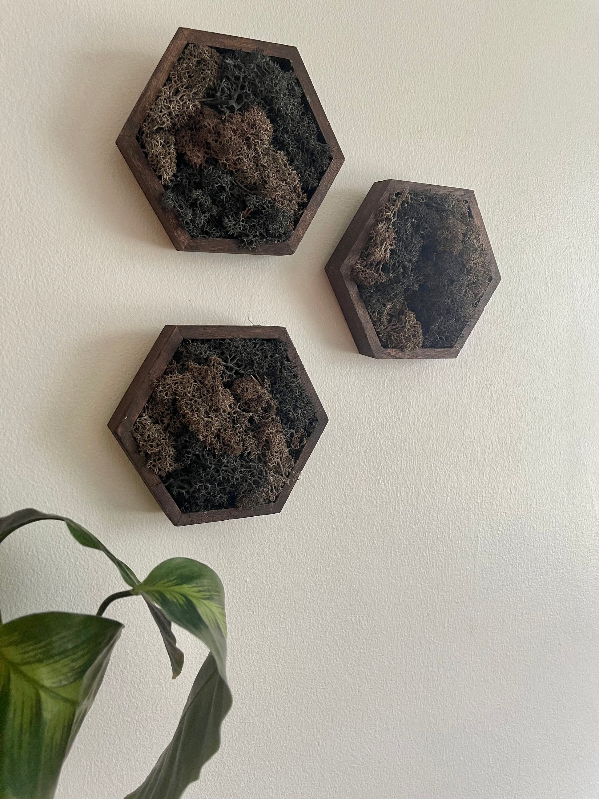 Moss Wall Art | Honeycomb Moss | Home Decor | Wood Hexagon | Black and Brown | Wood and Charcoal Reindeer Moss
