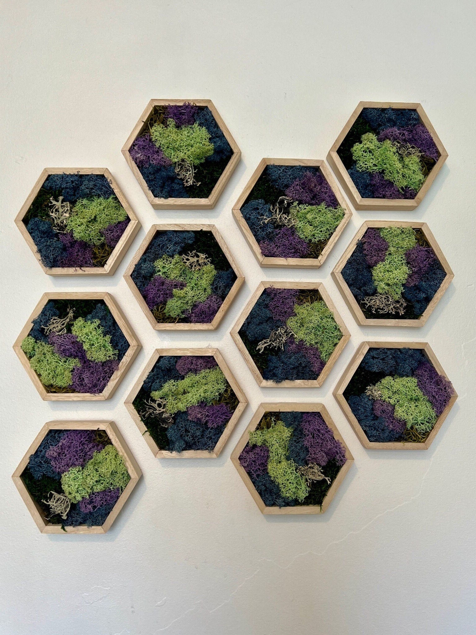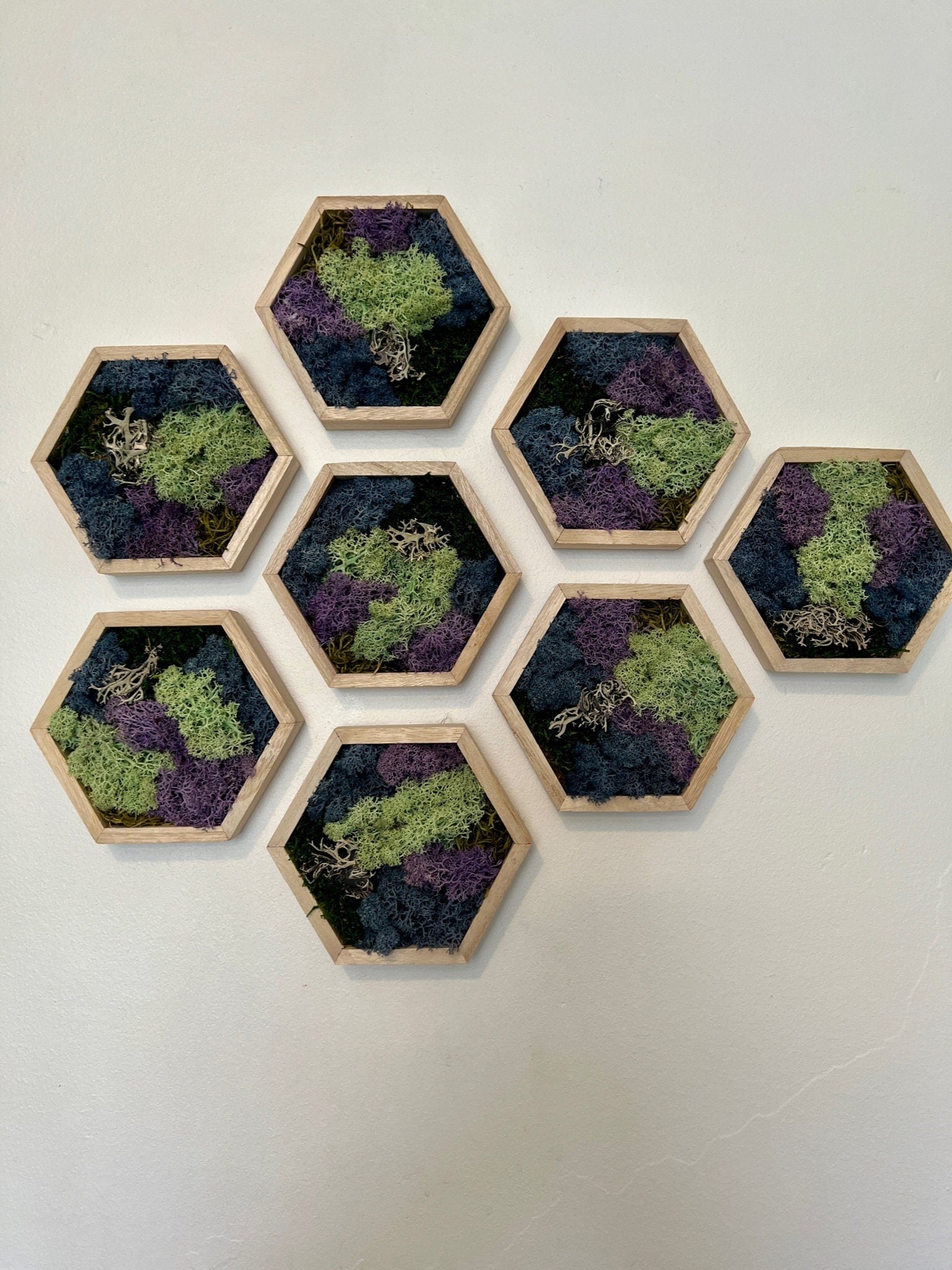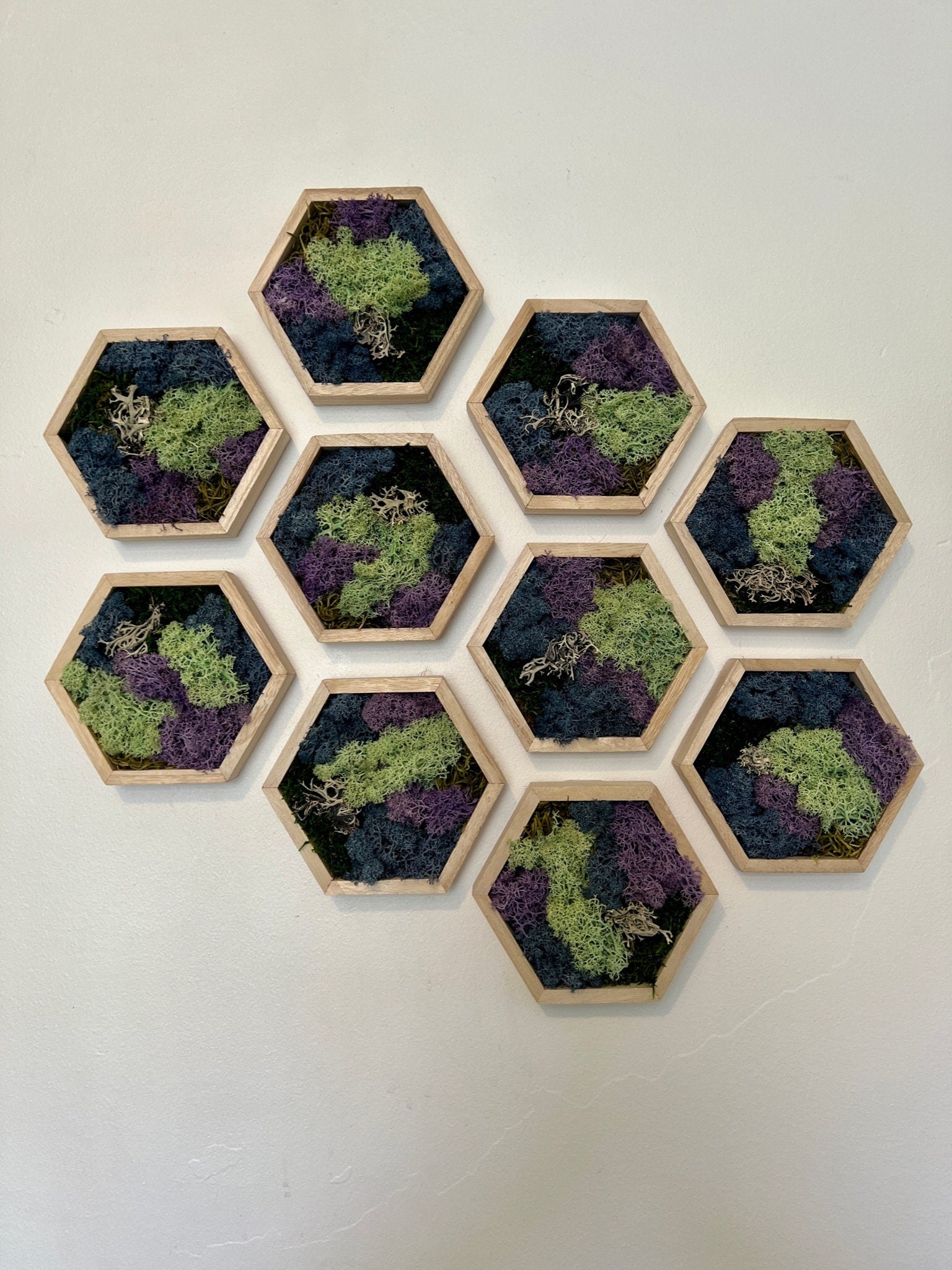 Moss Wall Art | Honeycomb Moss | Home Decor | Wood Hexagon | Blue Green and Purple