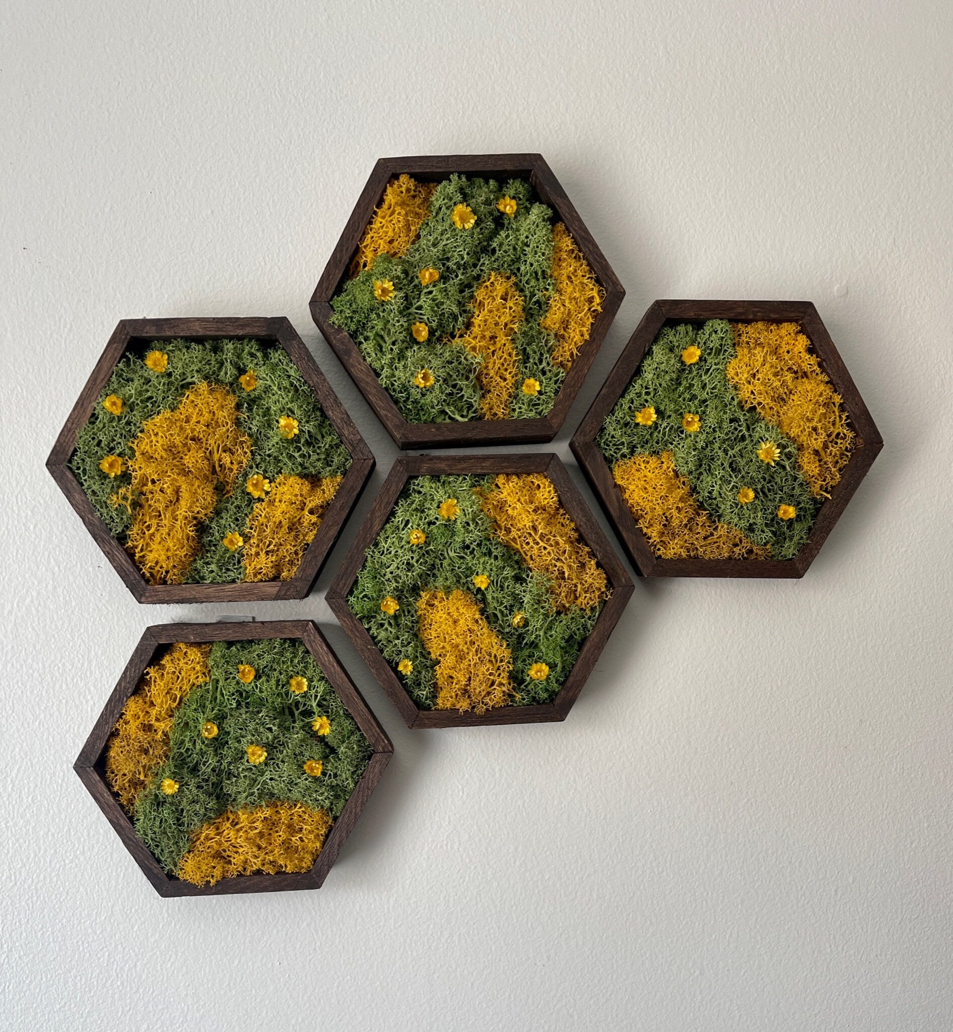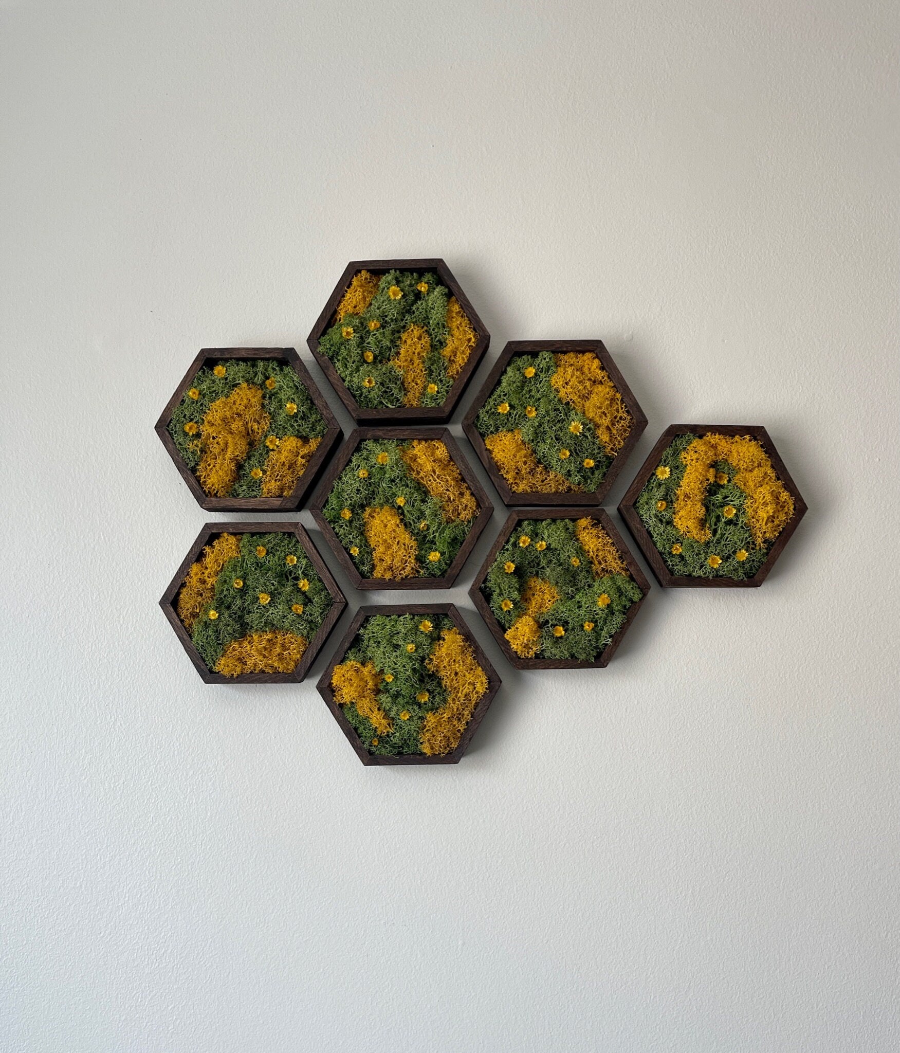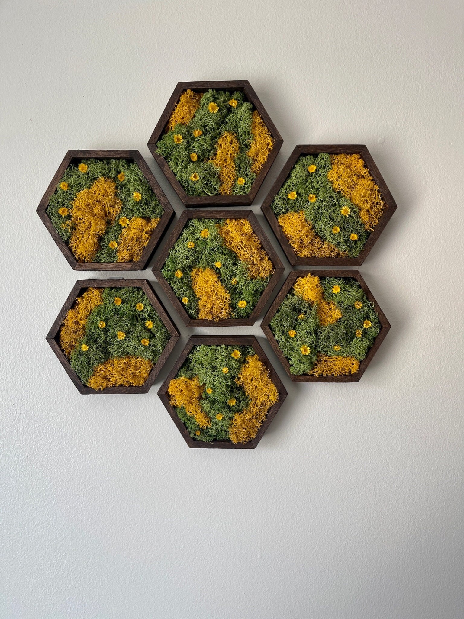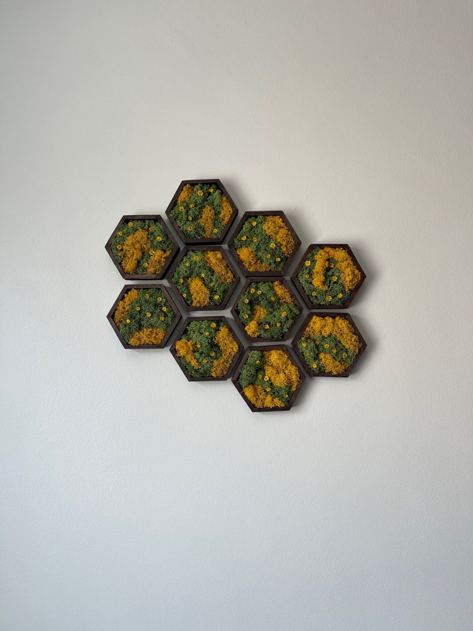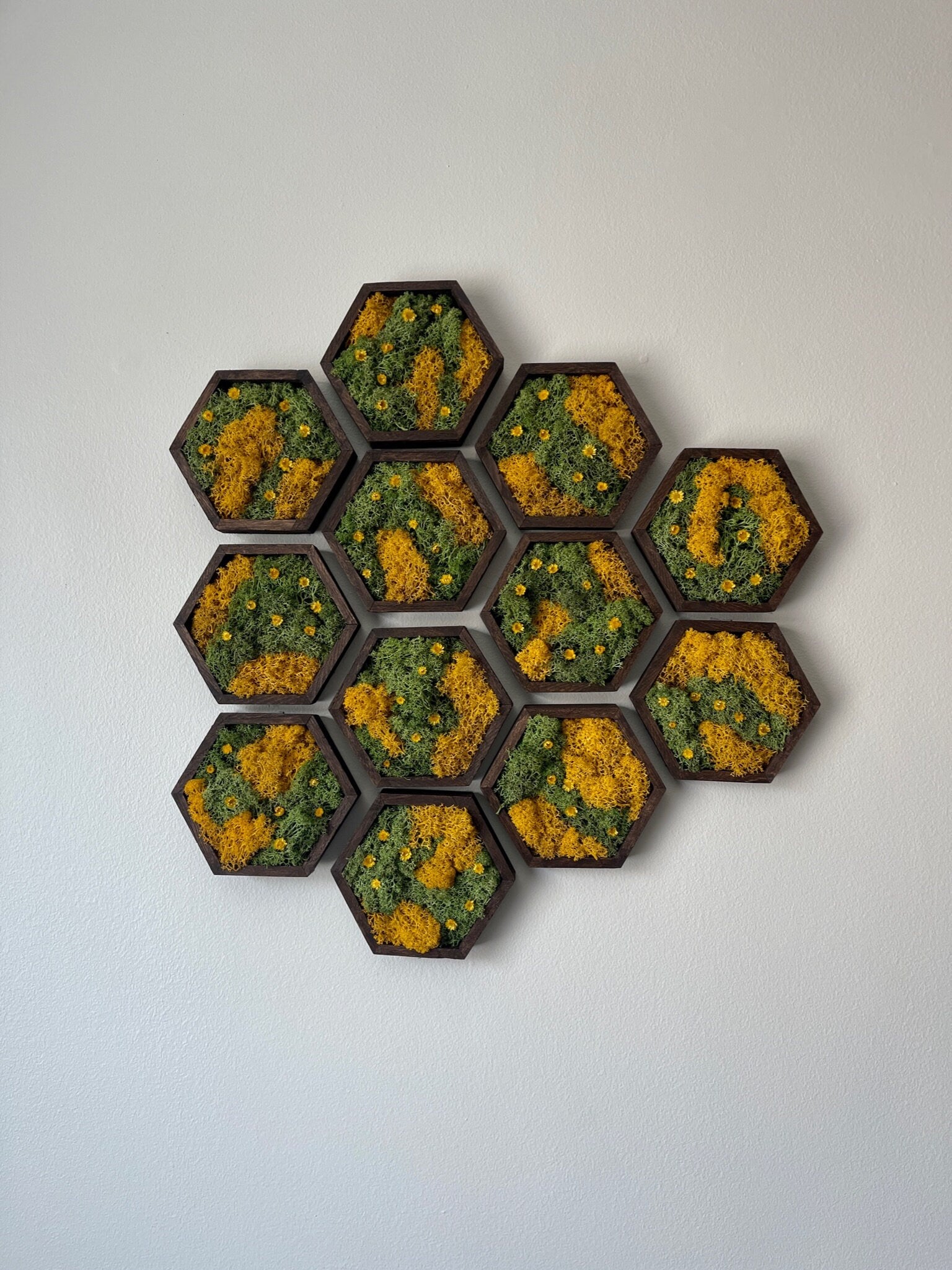 Moss Wall Art | Honeycomb Moss Single to Set of Twelve | Home Decor | Wood Hexagon | Green Yellow Preserved Flowers | Mothers Day Gift