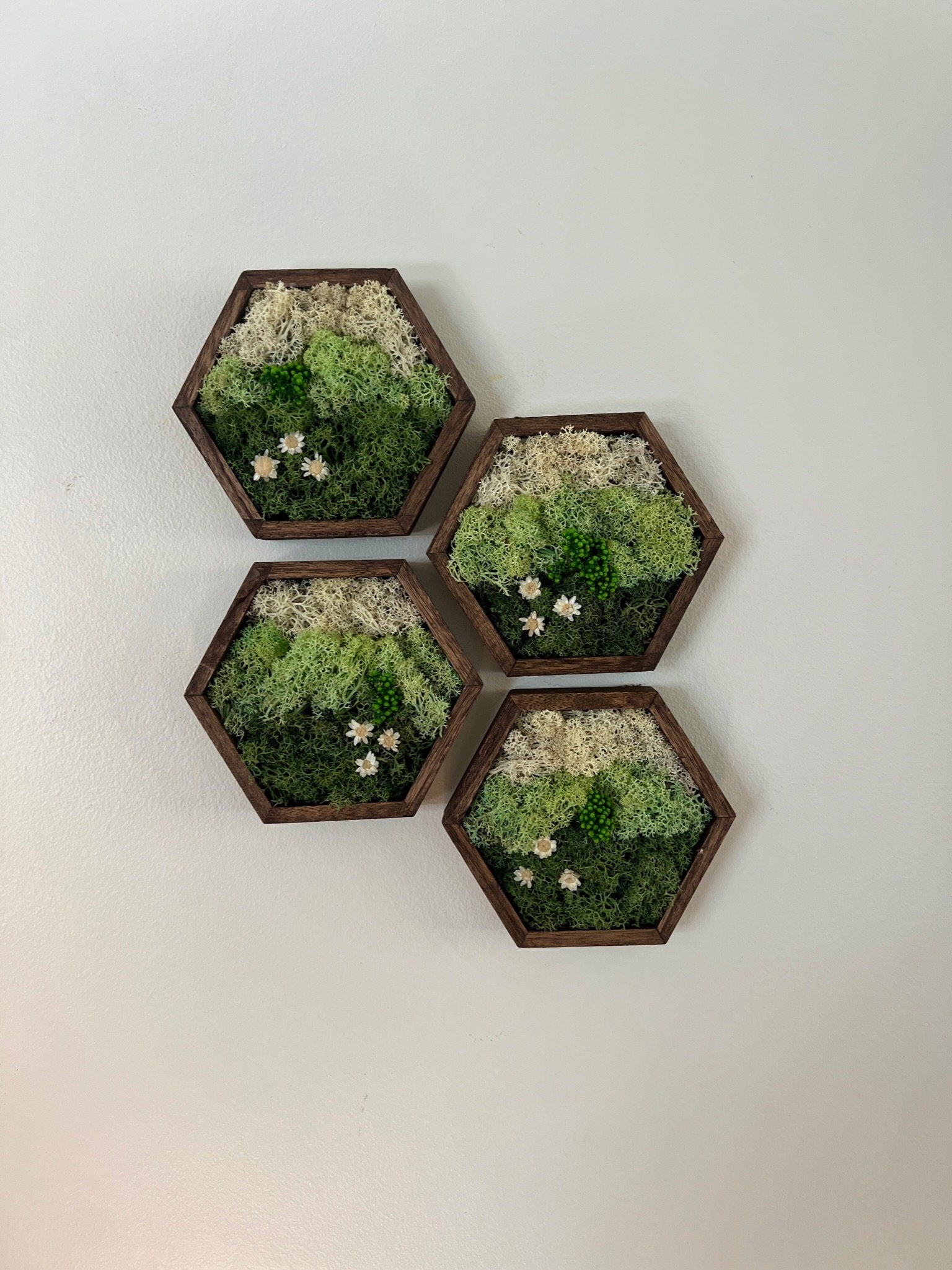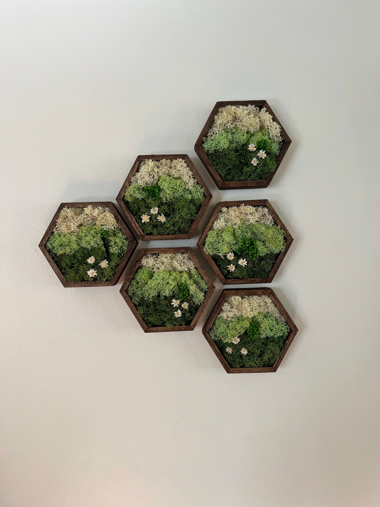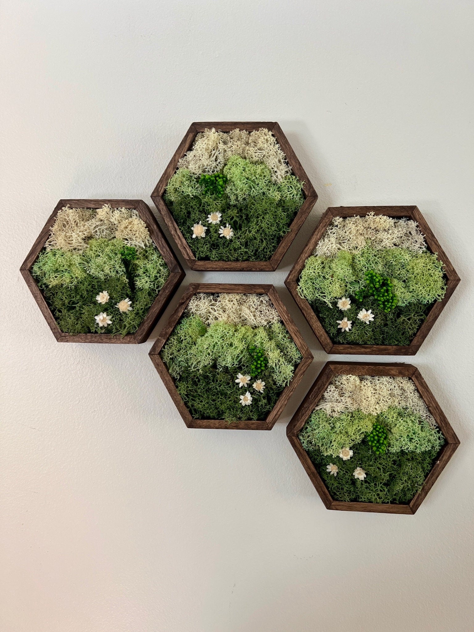Moss Wall Art | Honeycomb Moss Single to Set of Twelve | Wood Hexagon | Green Mountains and Clouds | Preserved Flowers | Nature Wall Art