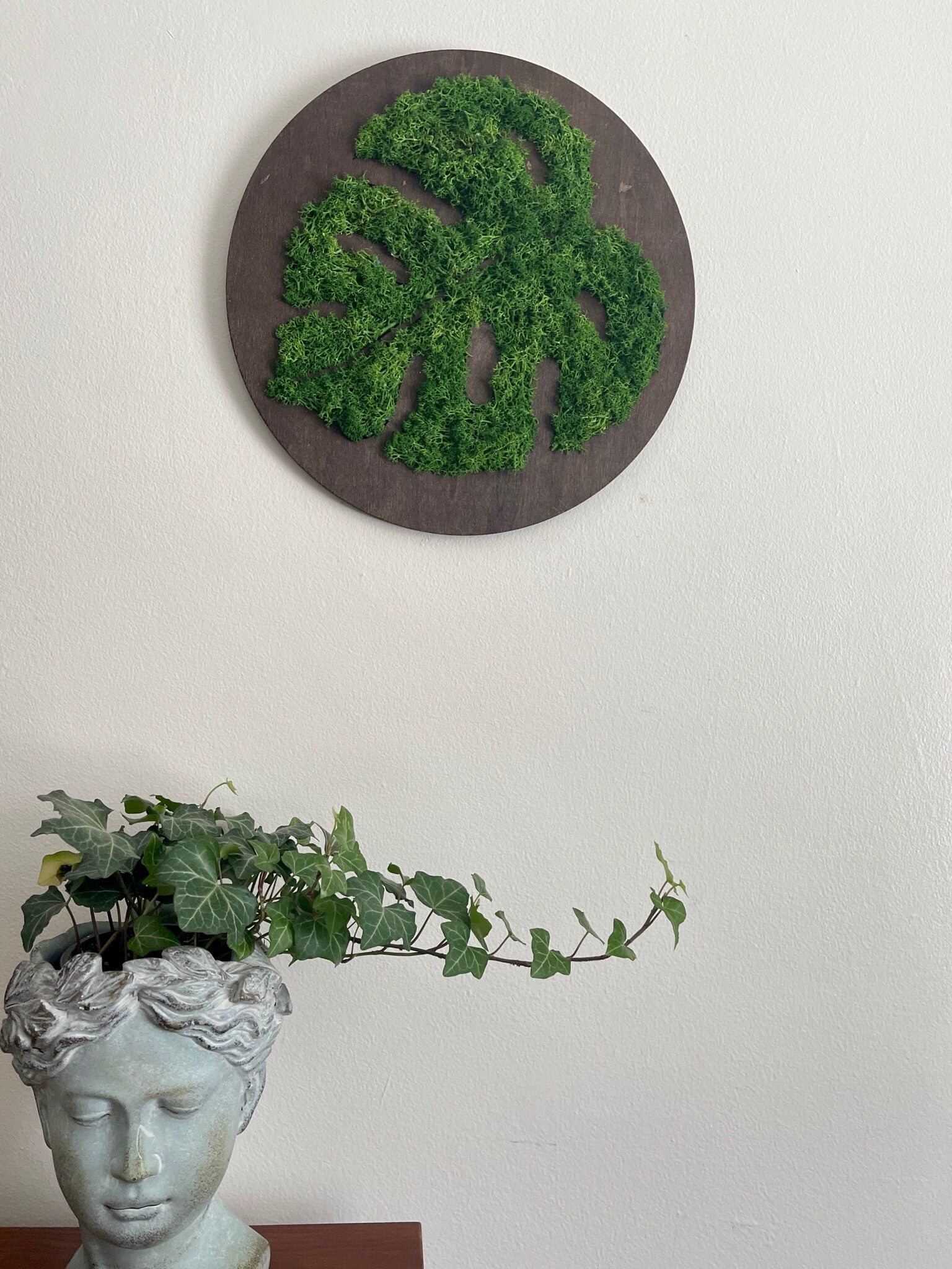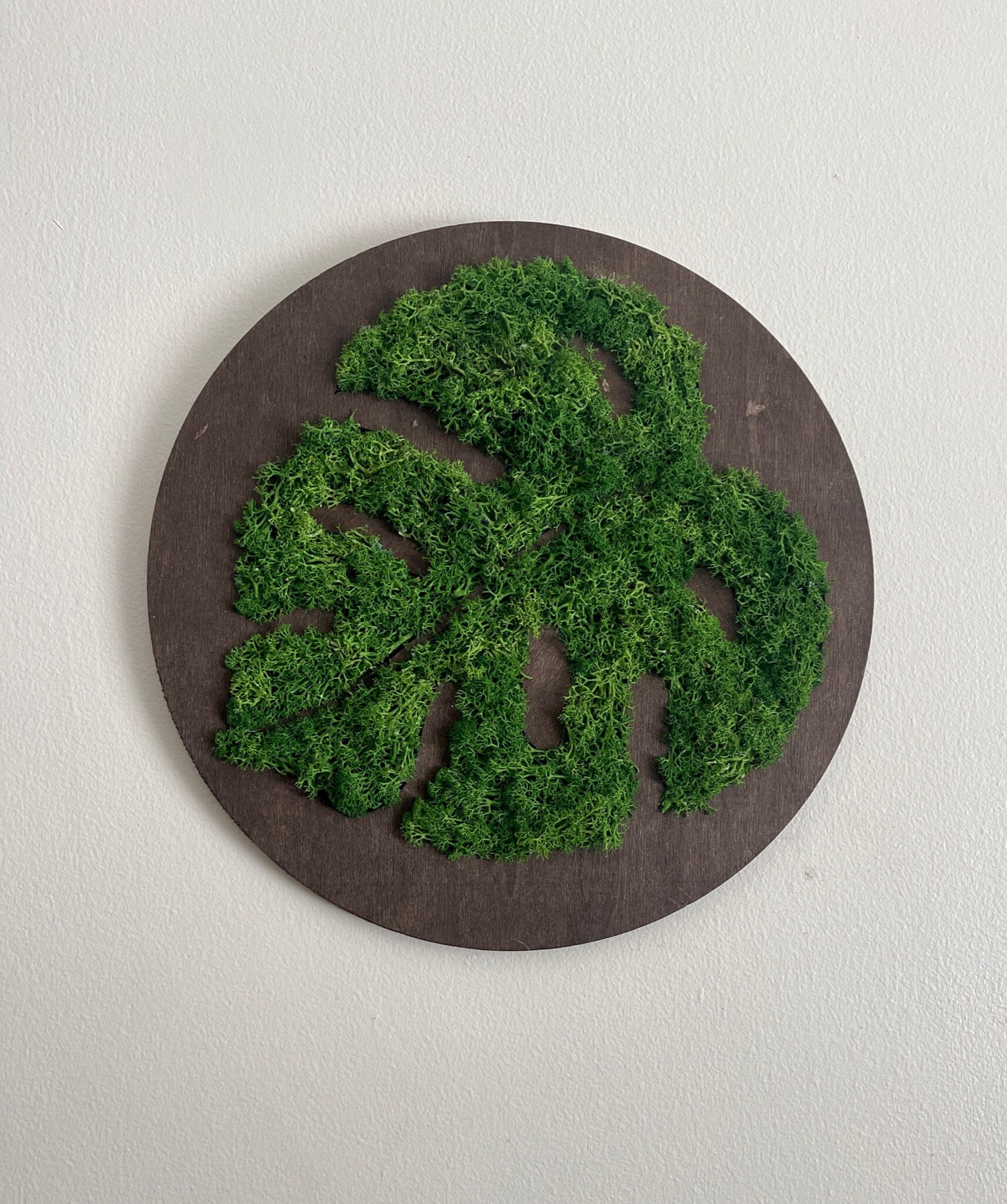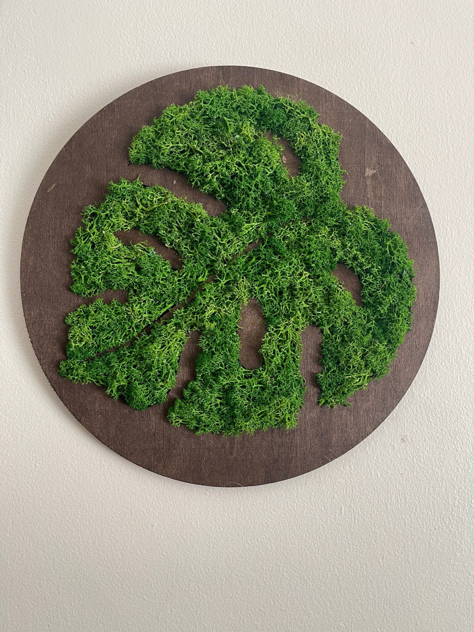 Moss Wall Art | Monstera Plant Round Wood Frame | Dark Green Reindeer Moss | Wedding Gift
