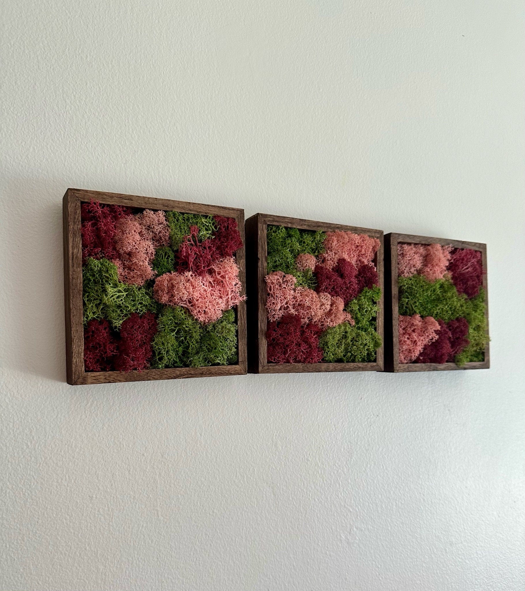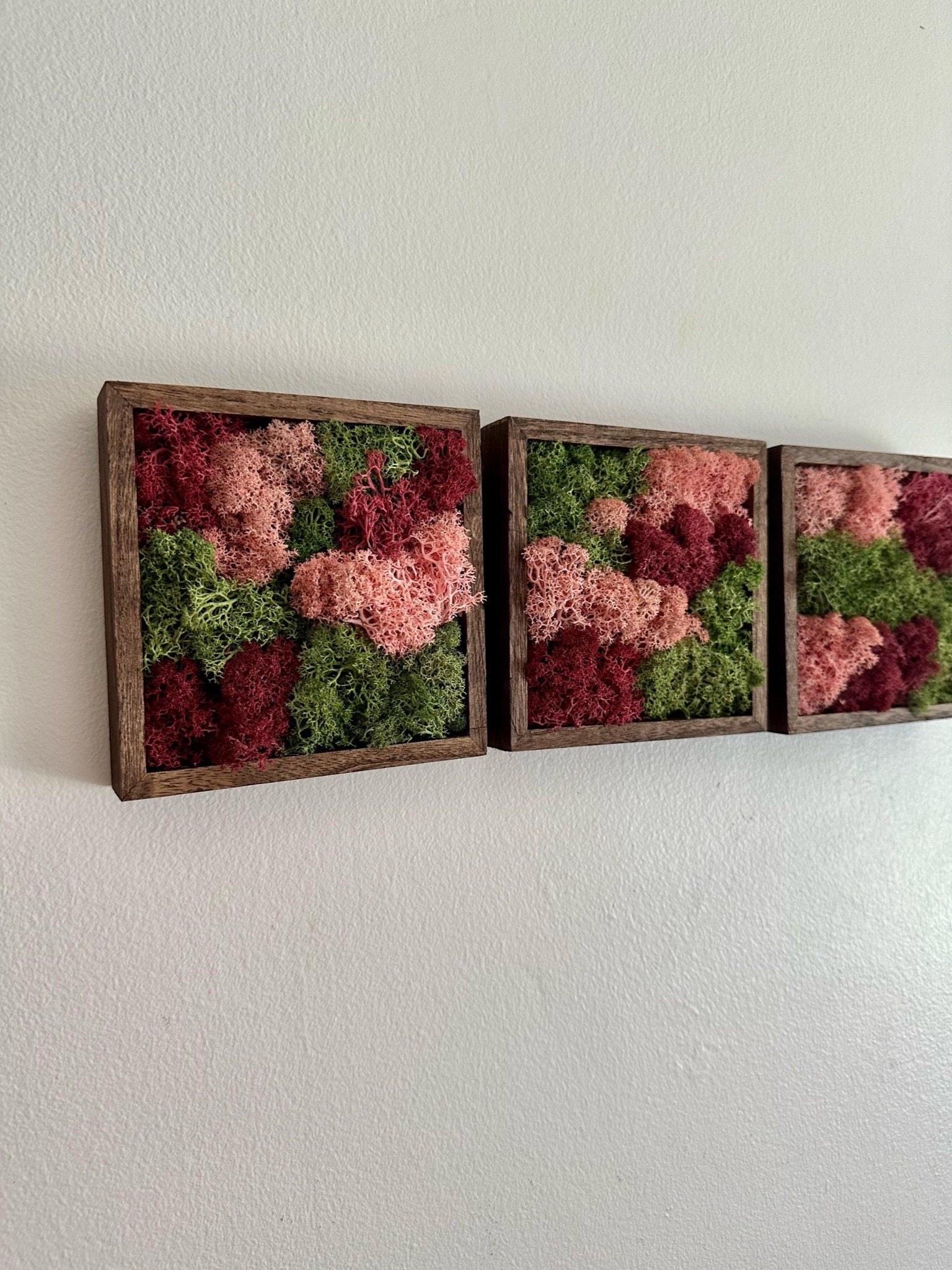 Moss Wall Art | Preserved Moss Art Framed | Moss Square Wood Frame | Green and Pink