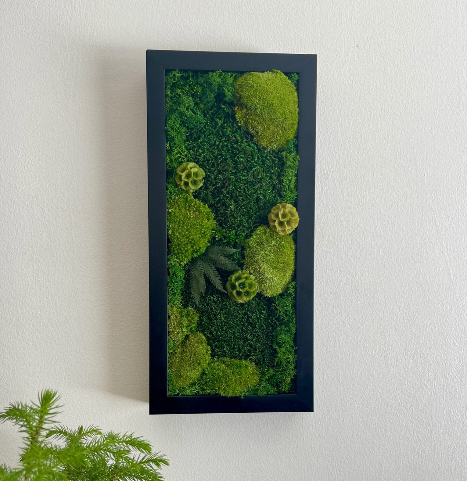 The includes one, two or three 14 " by 6 " black frame carefully assembled with preserved reindeer moss, hardware attached for hanging on each frame.
