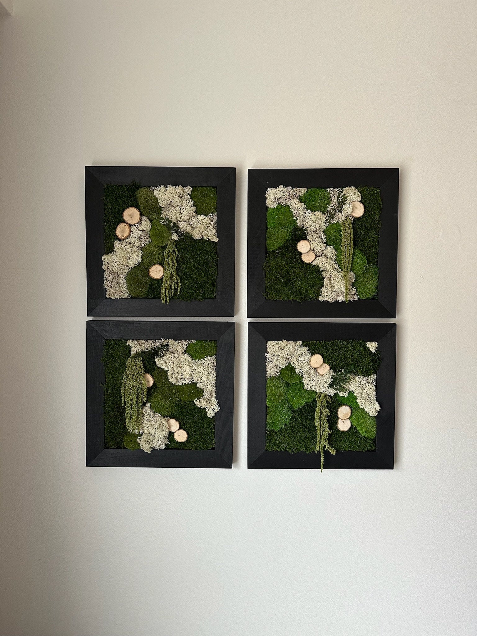 One 12 " by 12 " wood frame carefully assembled with preserved reindeer moss with twine for hanging on each frame.