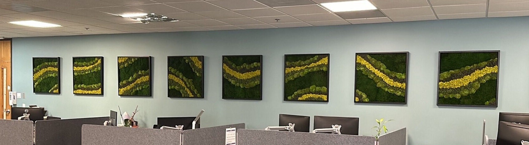 This listing offers a single frame to set of four frames, depending on selection - 20” x 20” by 2" deep wood frames carefully assembled with preserved reindeer moss, hardware attached for hanging on each frame. The frame hanging hardware is only vertical. Please contact us with a special request if you would like the horizontal hanging option.