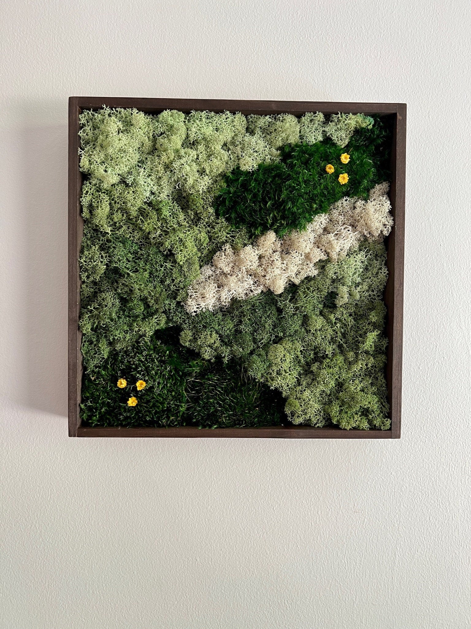 All of our Moss Art Pieces are made with Grade A Preserved Reindeer Moss (Lichen). It is made from 100% real natural mosses (lichen) and/or flowers that require no watering, no natural direct sunlight and no trimming.
