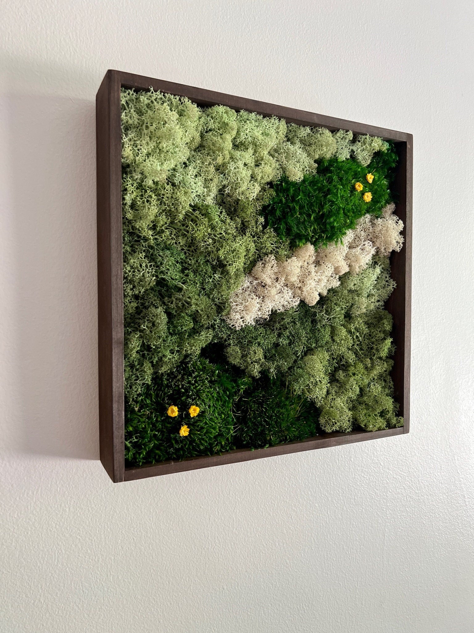 Moss Wall Art | Preserved Moss Framed | Moss Wall Decor | Square Frame | Mood Moss with Preserved Flowers, Reindeer Moss