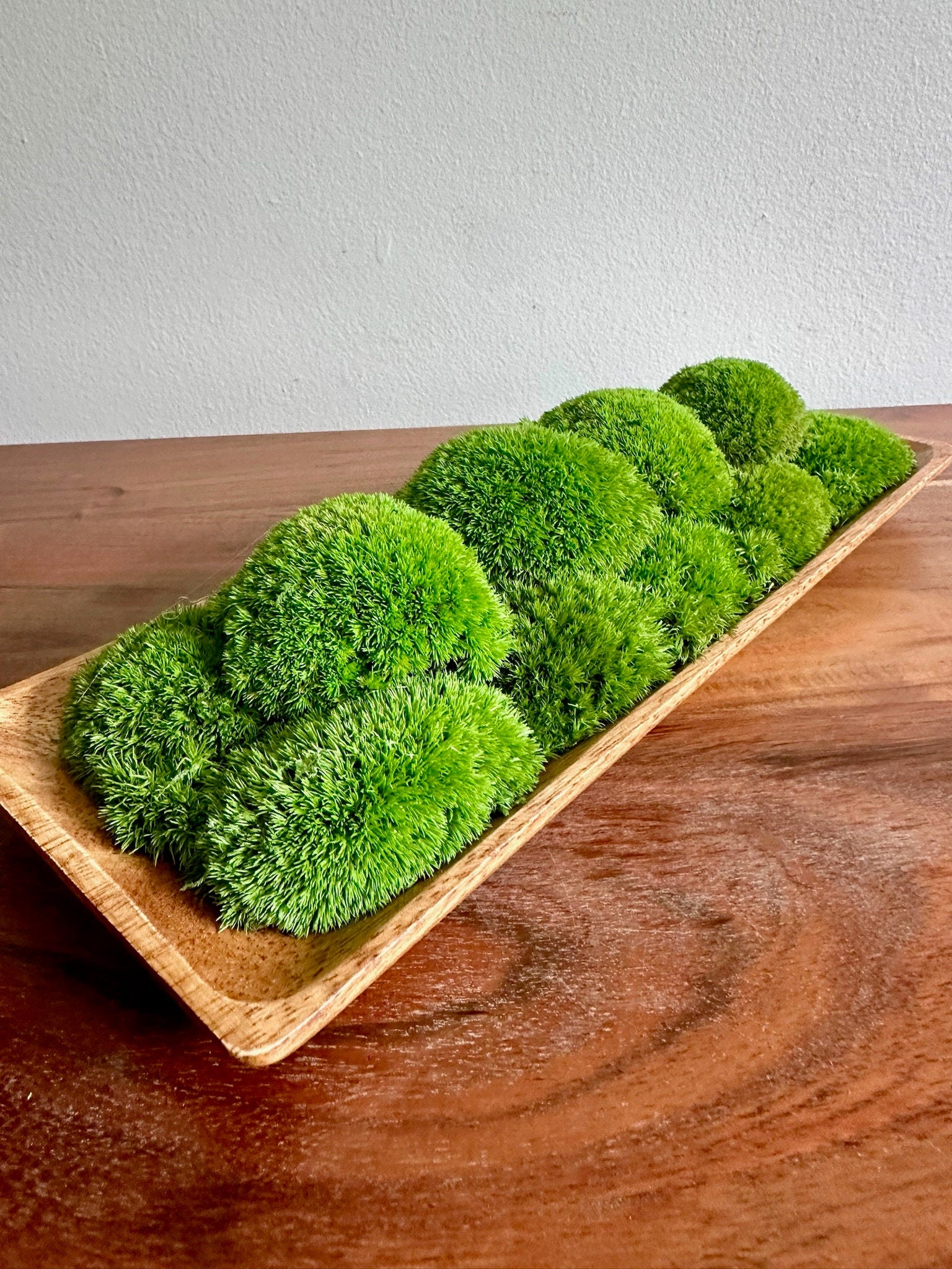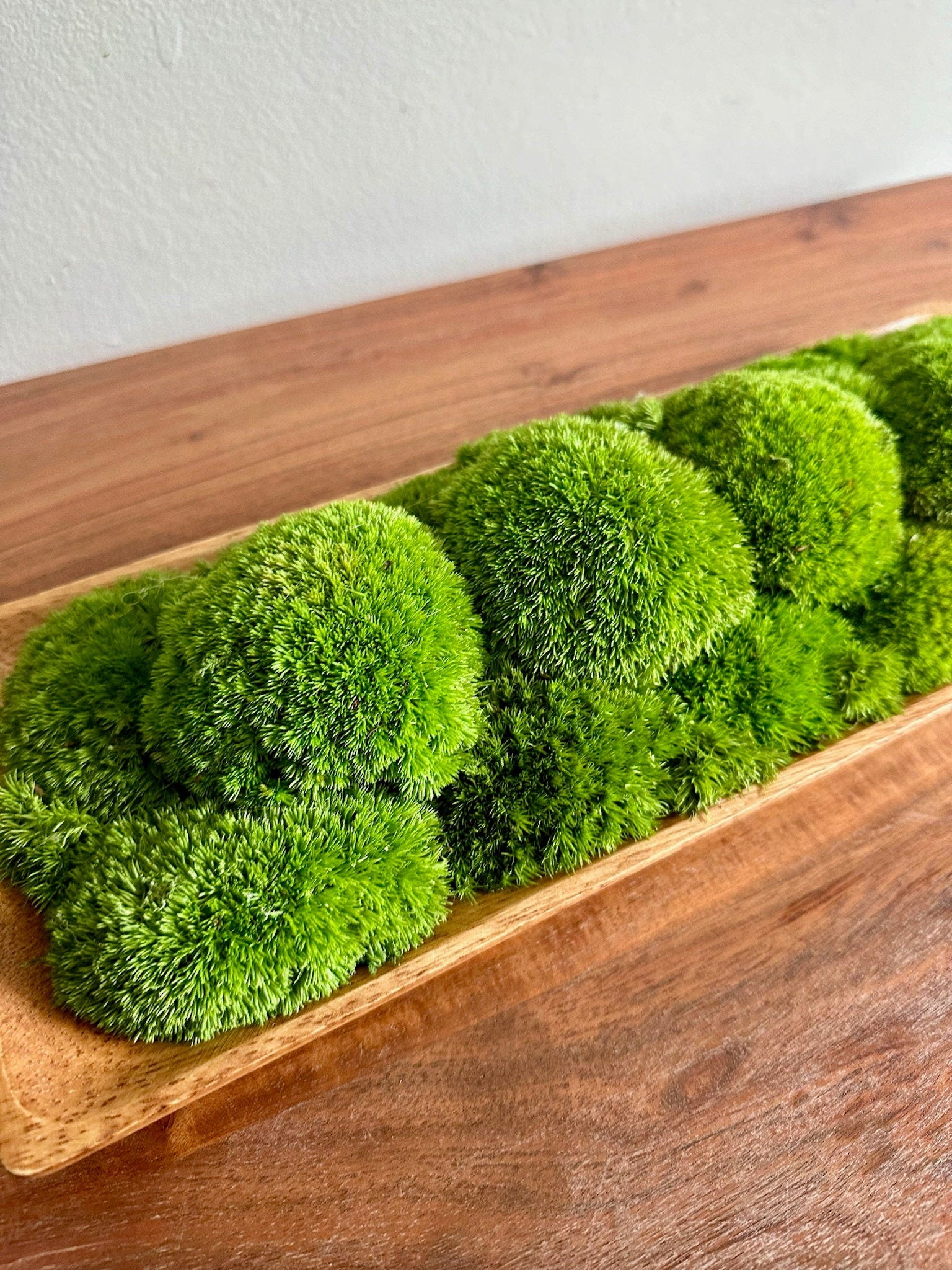 Moss Bowl 14" length, width 5" by 3" high, carefully assembled with preserved pole moss and reindeer moss with a olive wood rectangle centrepiece. Beautiful nature centrepiece.