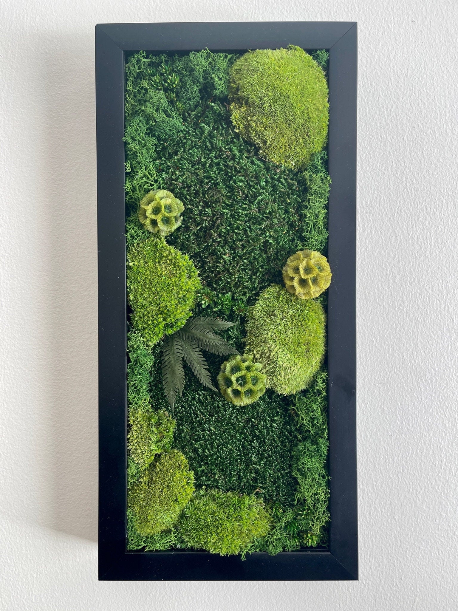 Preserved Moss Wall Art: Black Frame, Reindeer Moss & Flowers | USA - TARIFF FREE