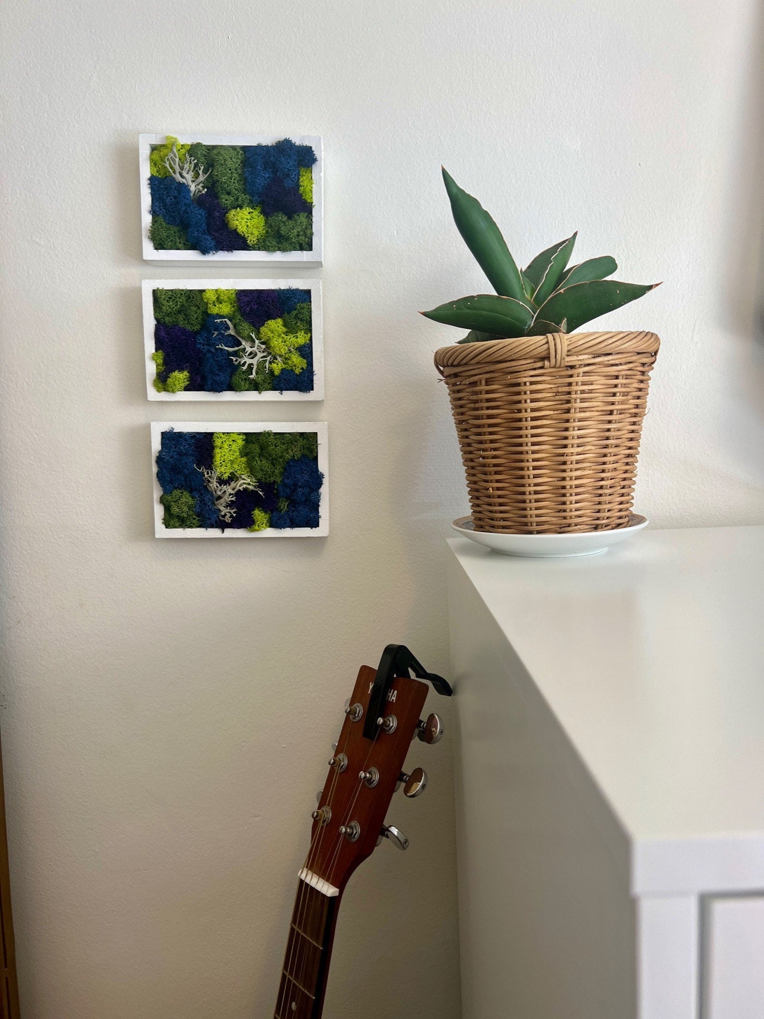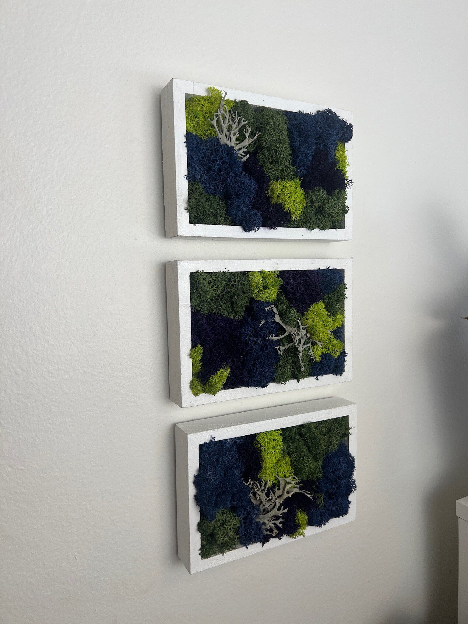 The trio includes three 5 " by 4 " wood frames carefully assembled with preserved reindeer moss with twine and hardware for hanging on each frame.