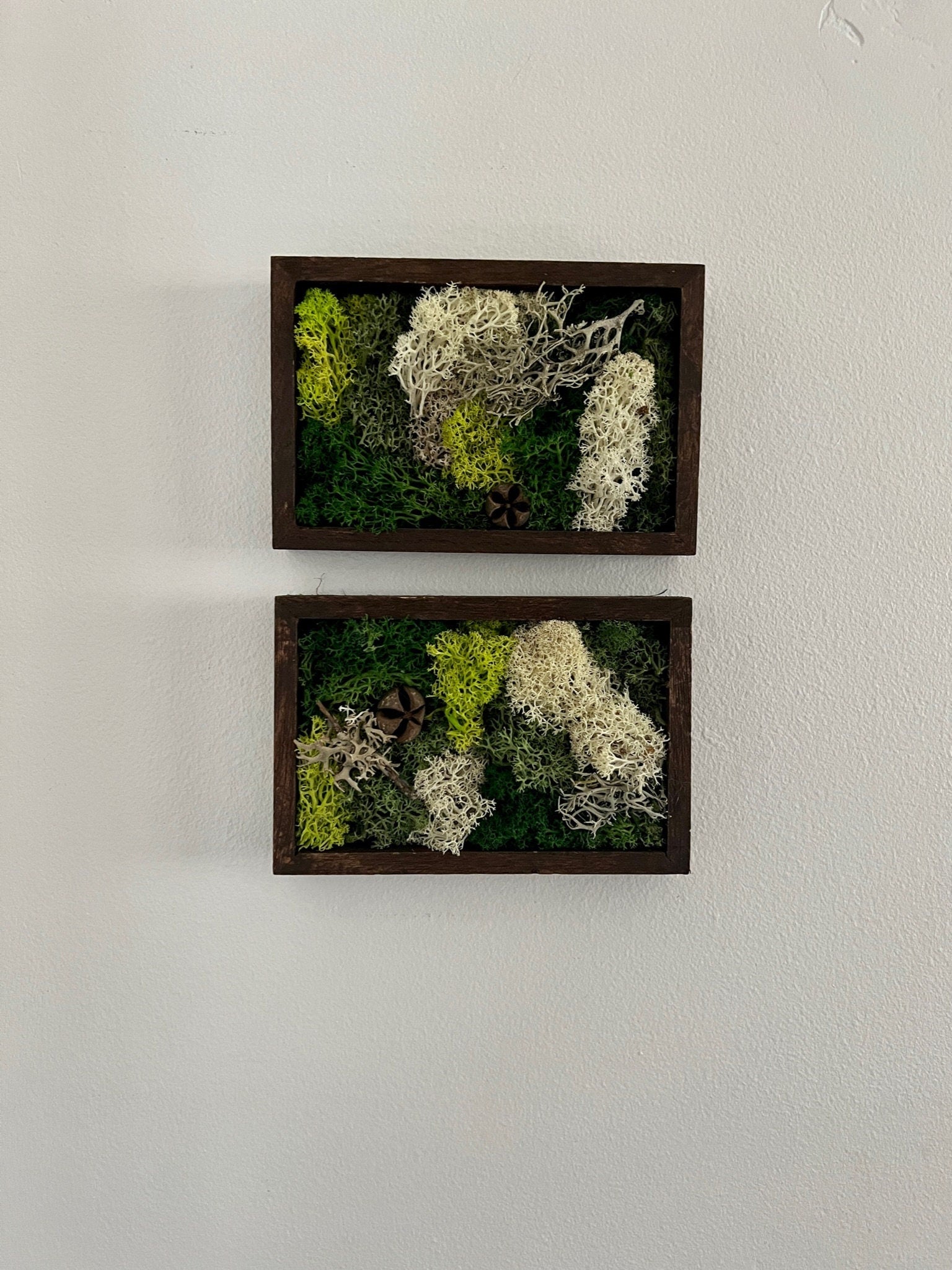The trio includes three 5 " by 4 " wood frames carefully assembled with preserved reindeer moss with twine and hardware for hanging on each frame.