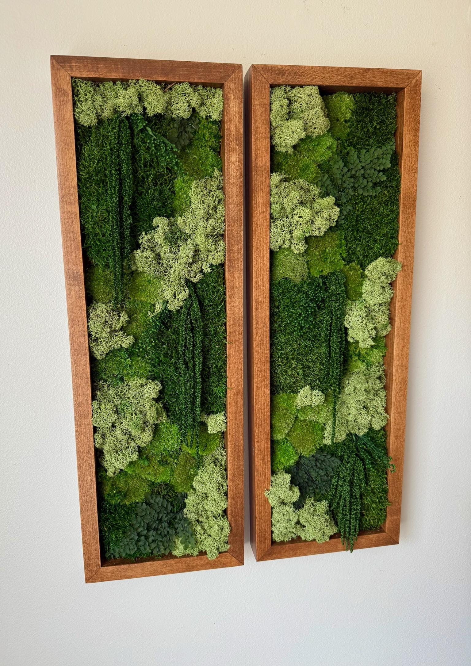The includes one to four - 36” x 12” by 2" deep wood frames carefully assembled with preserved reindeer moss, hardware attached for hanging on each frame. The frame can be hung horizontally or vertically.