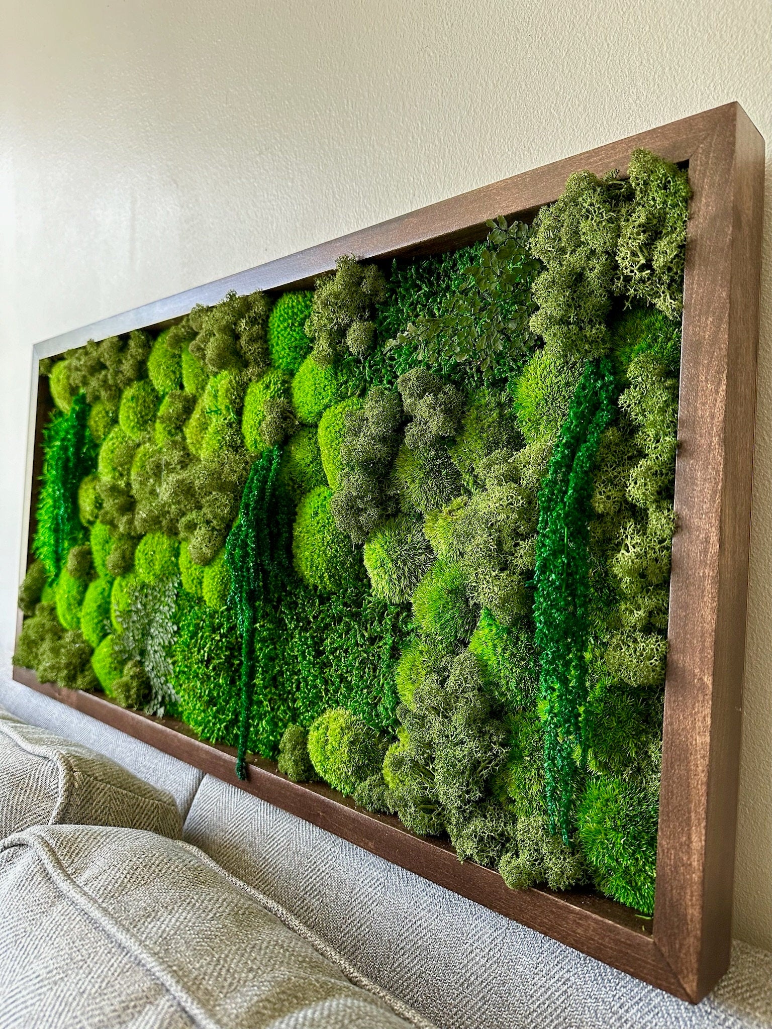 This listing offers a single frame to set of four frames, depending on selection - 30” x 15” by 2" deep wood frames carefully assembled with preserved reindeer moss, hardware attached for hanging on each frame. The frame hanging hardware is only horizontal. Please contact us with a special request if you would like the horizontal hanging option.