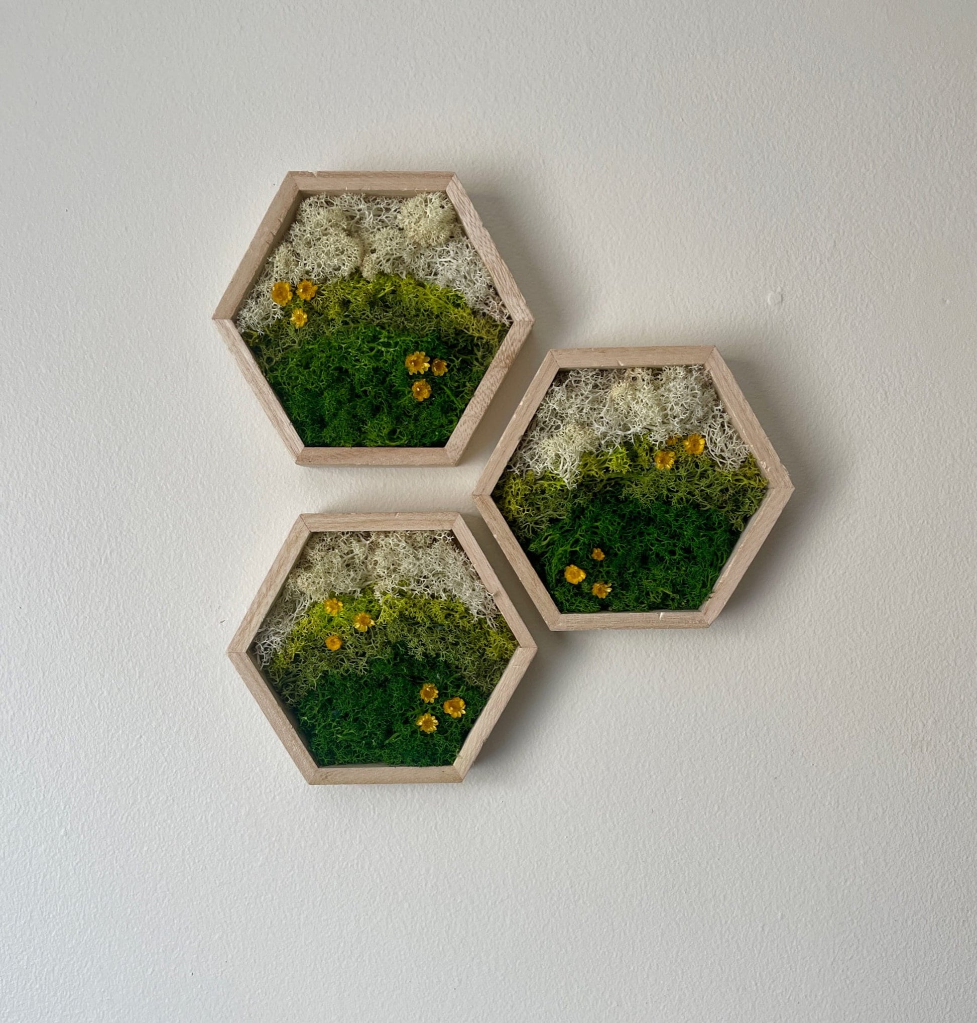 The trio includes three 6 " by 5 " wood frames carefully assembled with preserved reindeer moss with twine and hardware for hanging on each frame.