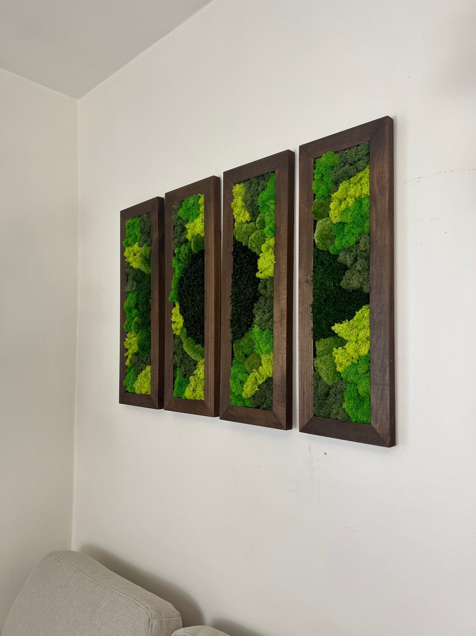The includes one to six - 24" by 8" inches, wood frames carefully assembled with preserved reindeer moss, hardware attached for hanging on each frame. The frame can be hung horizontally or vertically.