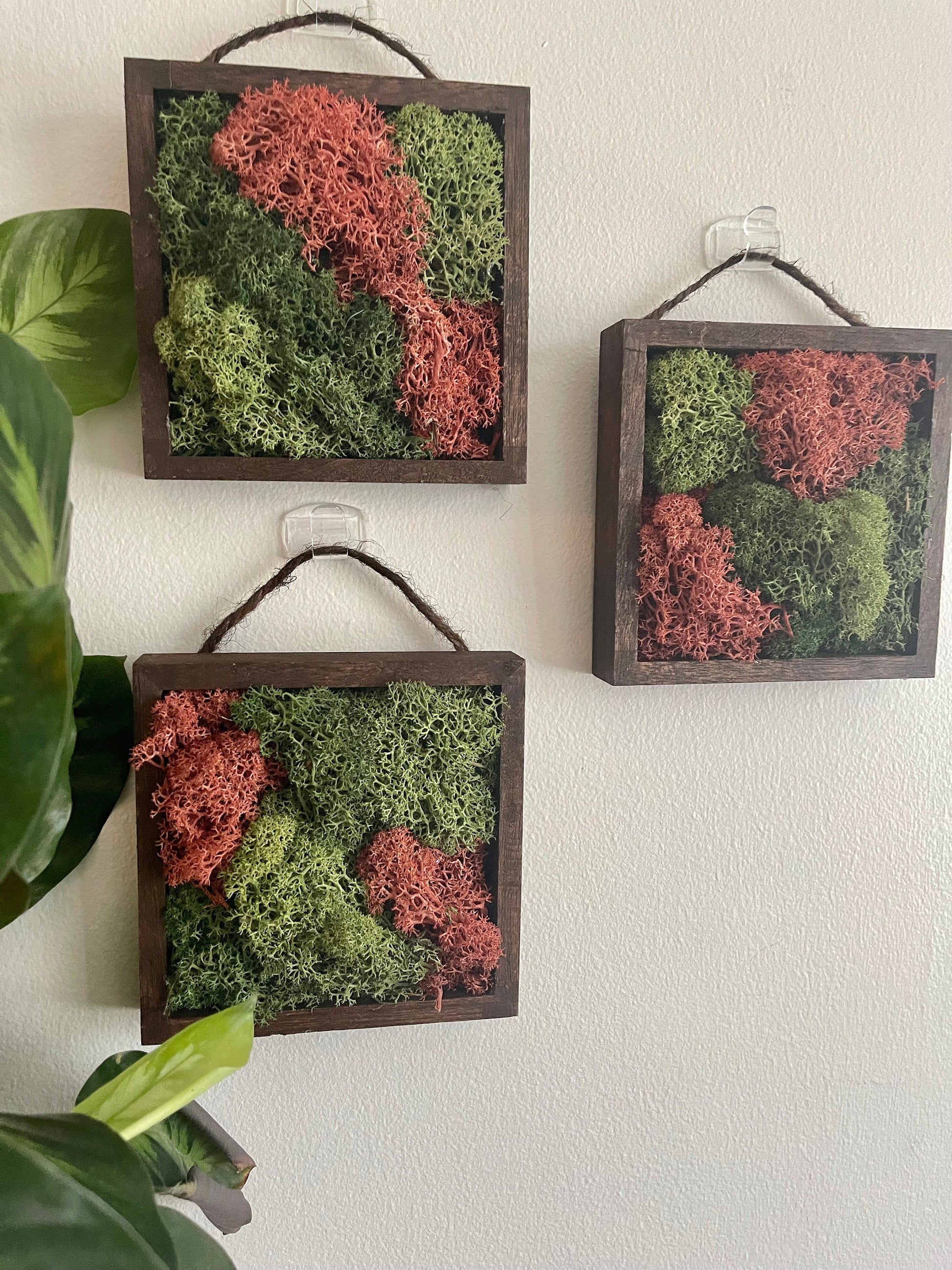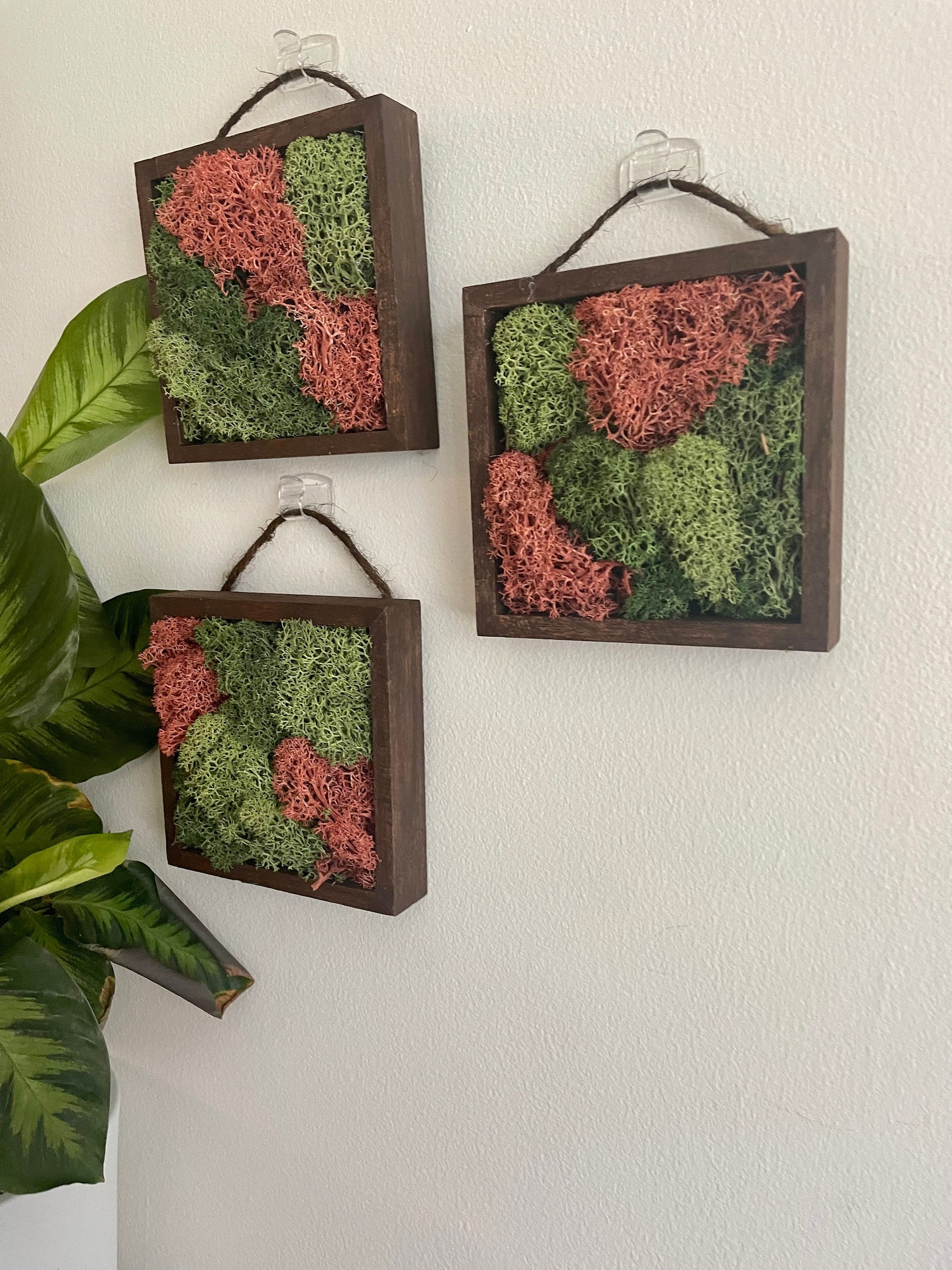 Frame set options of 5" by 5" wood frames carefully assembled with preserved reindeer moss with twine and hardware for hanging on each frame.