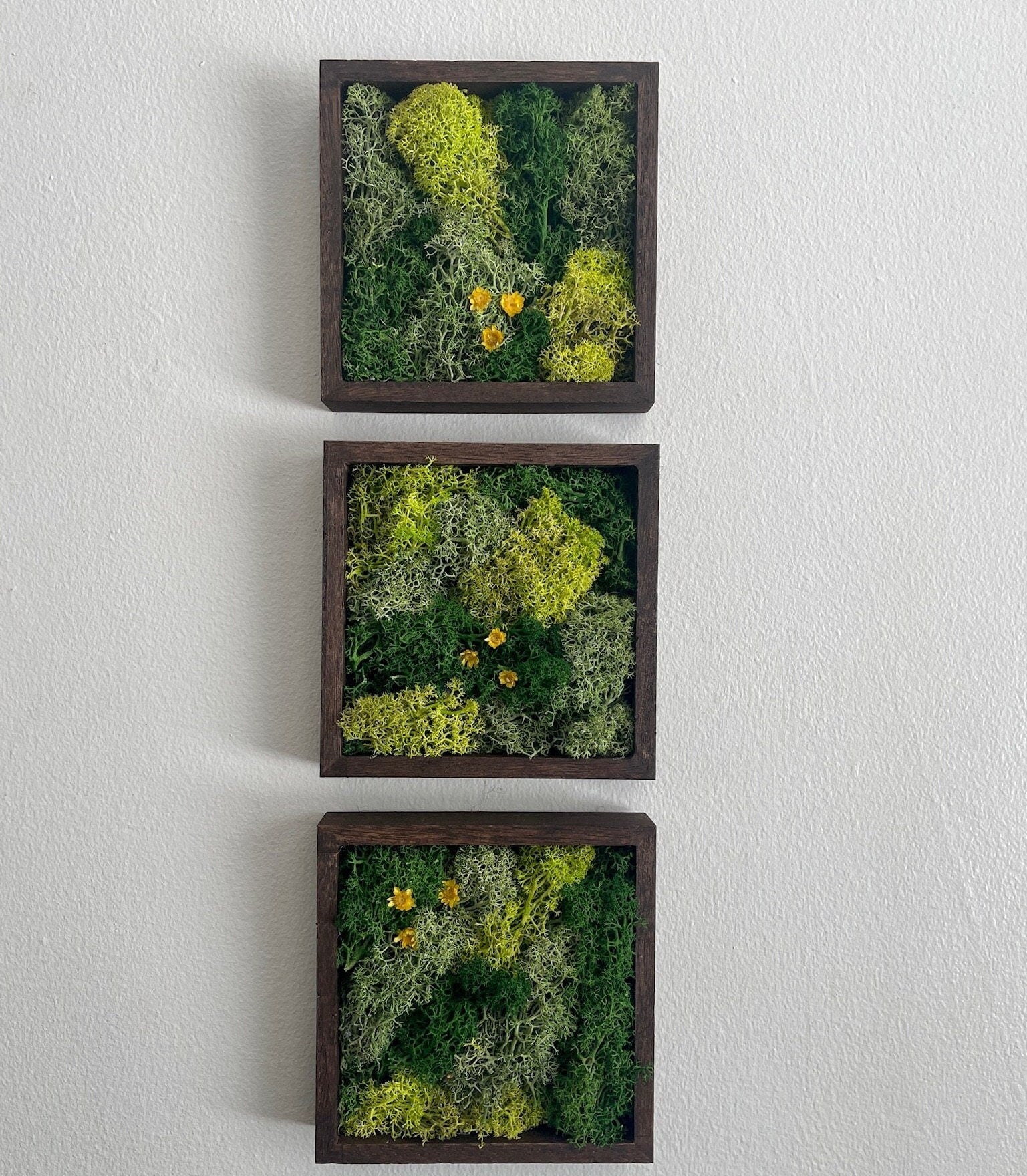 Single to set of six 5" x 5" or 8" x 8" wood frames carefully assembled with preserved reindeer moss with twine and hardware for hanging on each frame.