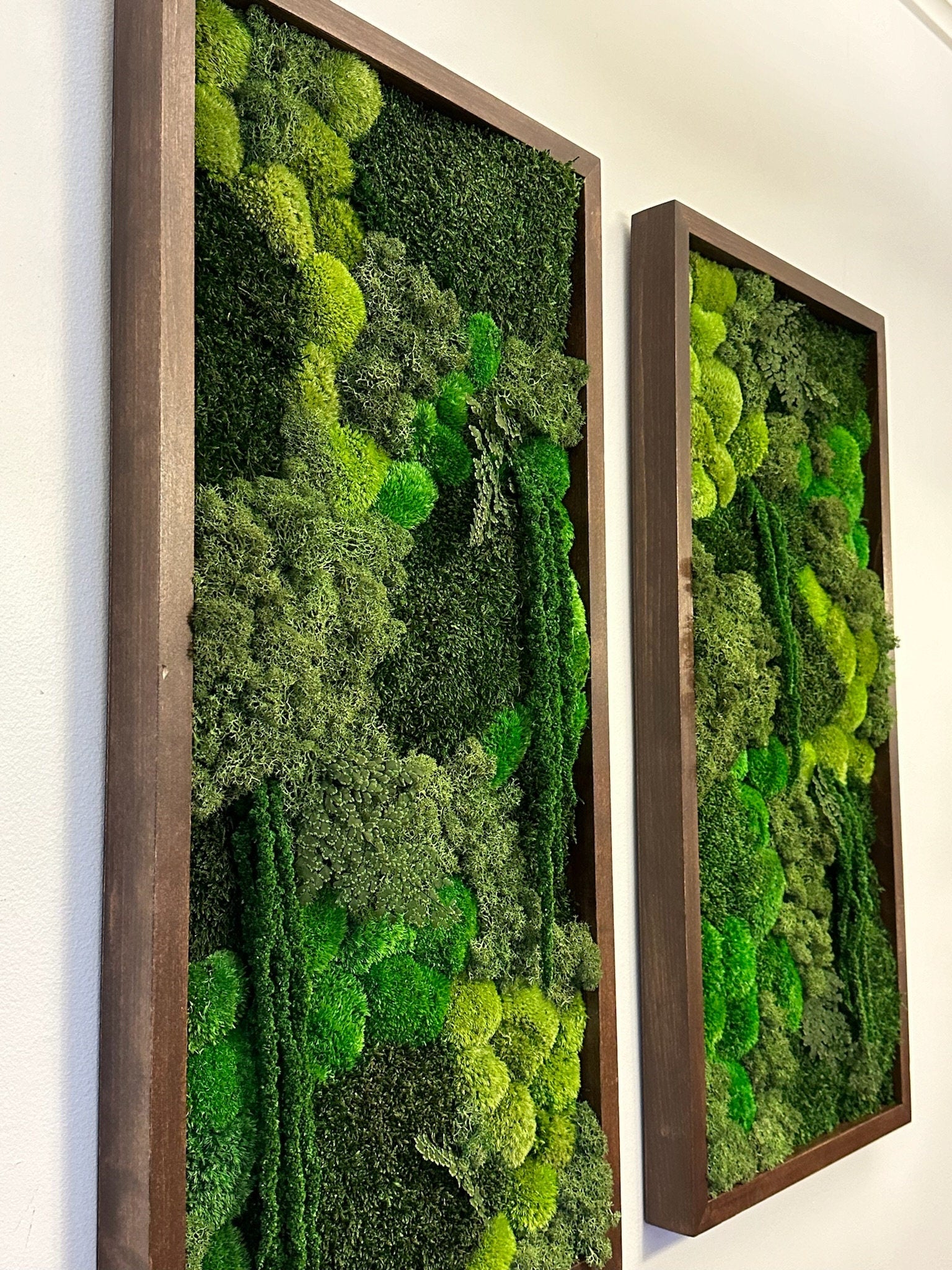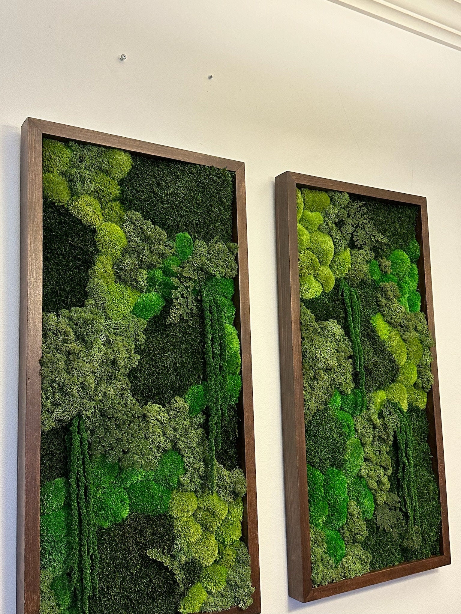 This listing offers a single frame to set of four frames, depending on selection - 30” x 15” by 2" deep wood frames carefully assembled with preserved reindeer moss, hardware attached for hanging on each frame. The frame hanging hardware is only vertical. Please contact us with a special request if you would like the horizontal hanging option.