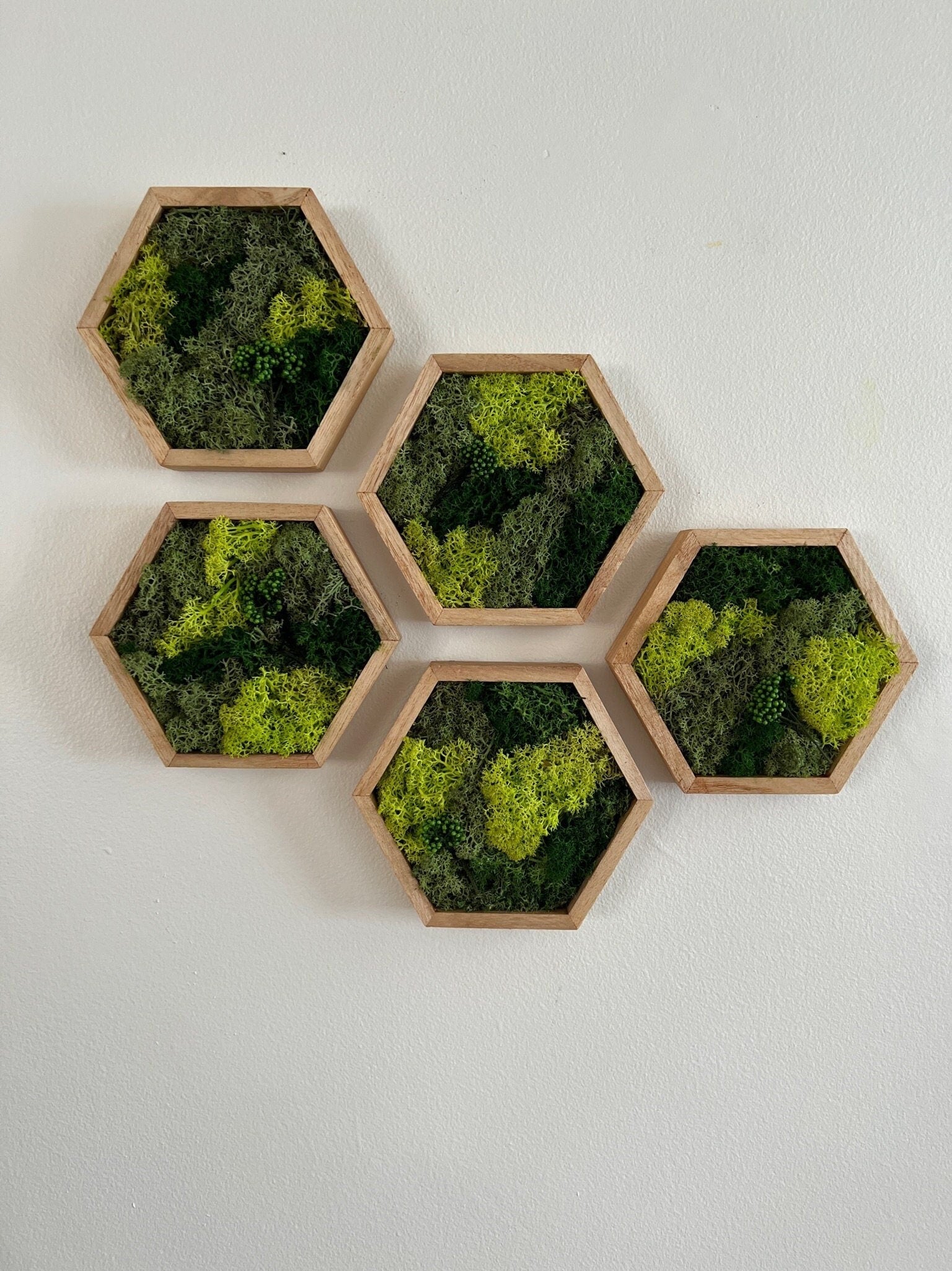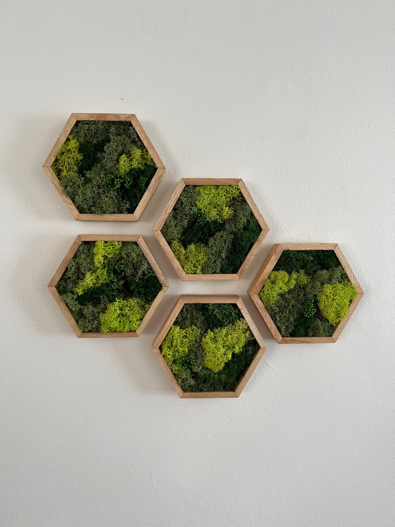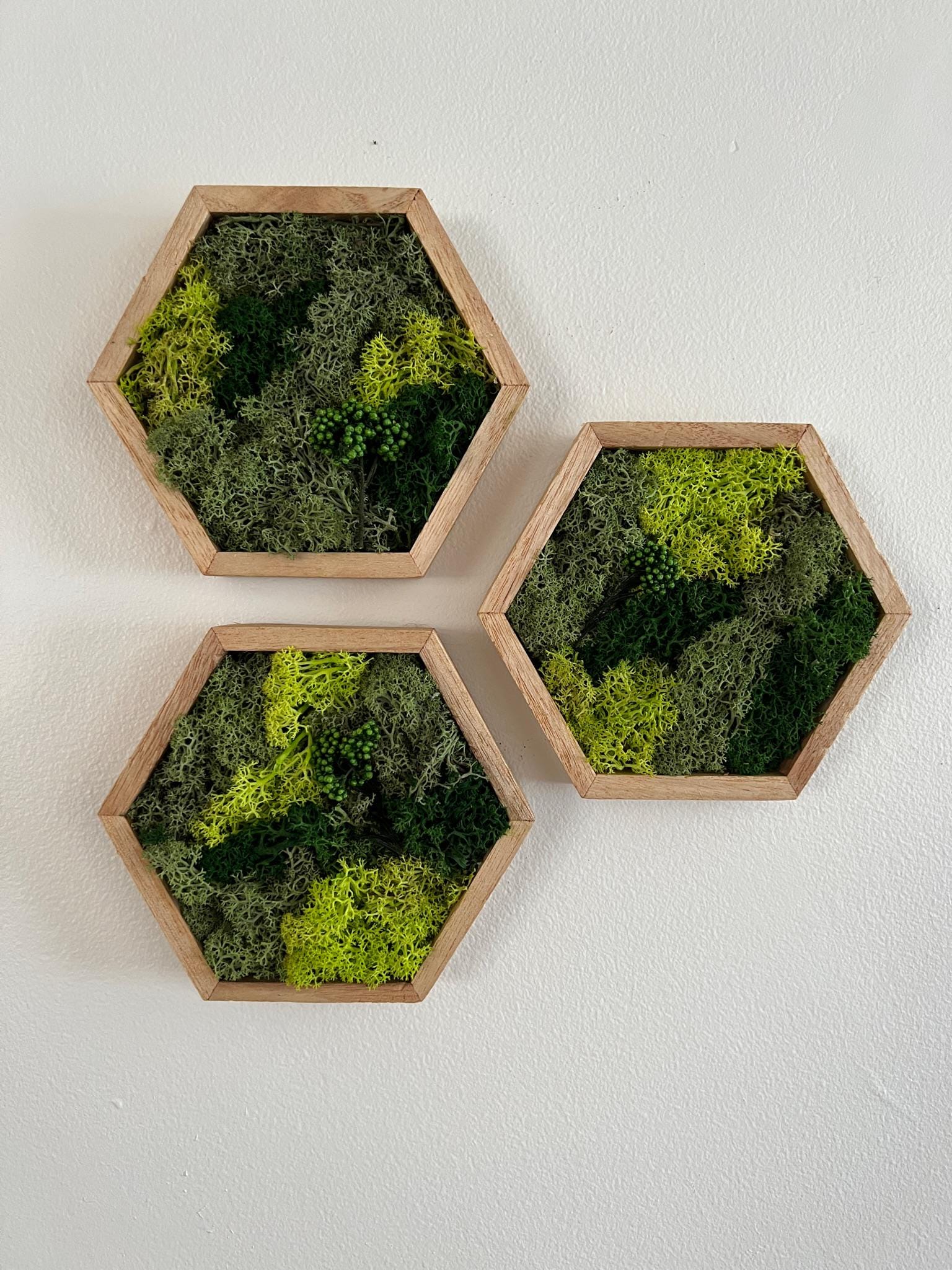 Reindeer Moss Wall Art: Hexagon Wood Frame, Preserved Nature Decor | USA - TARIFF FREE
