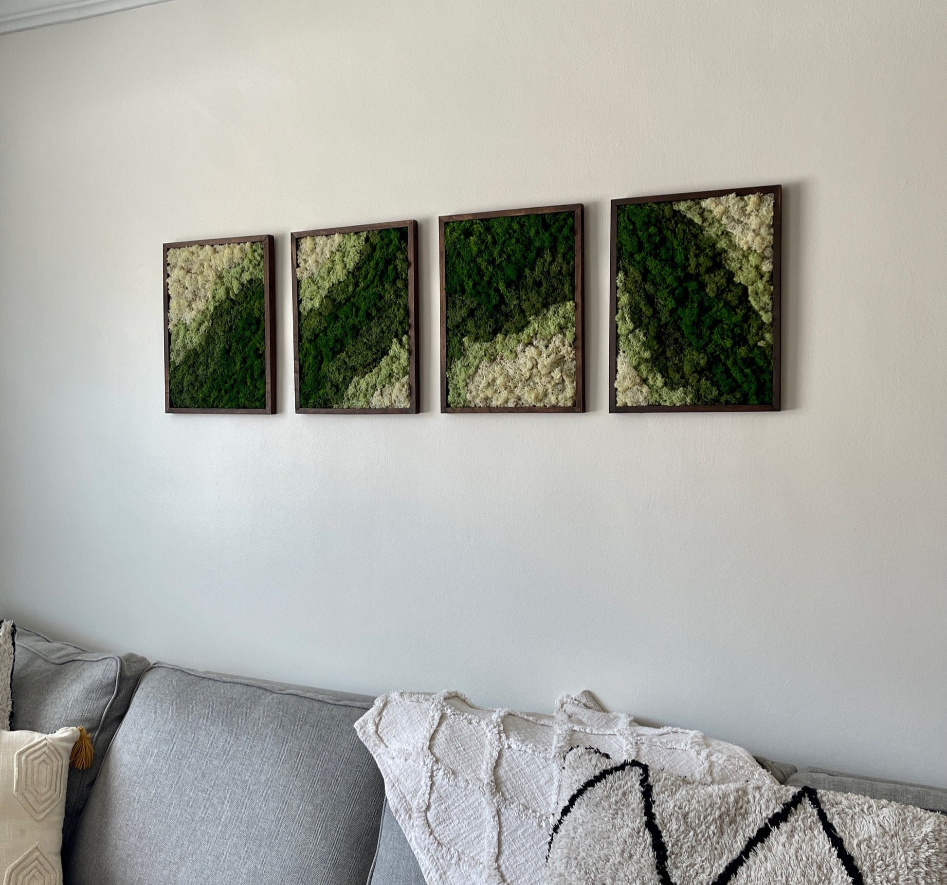 One to Four 12 " by 16 " wood frame carefully assembled with preserved reindeer moss with hook for hanging on each frame.